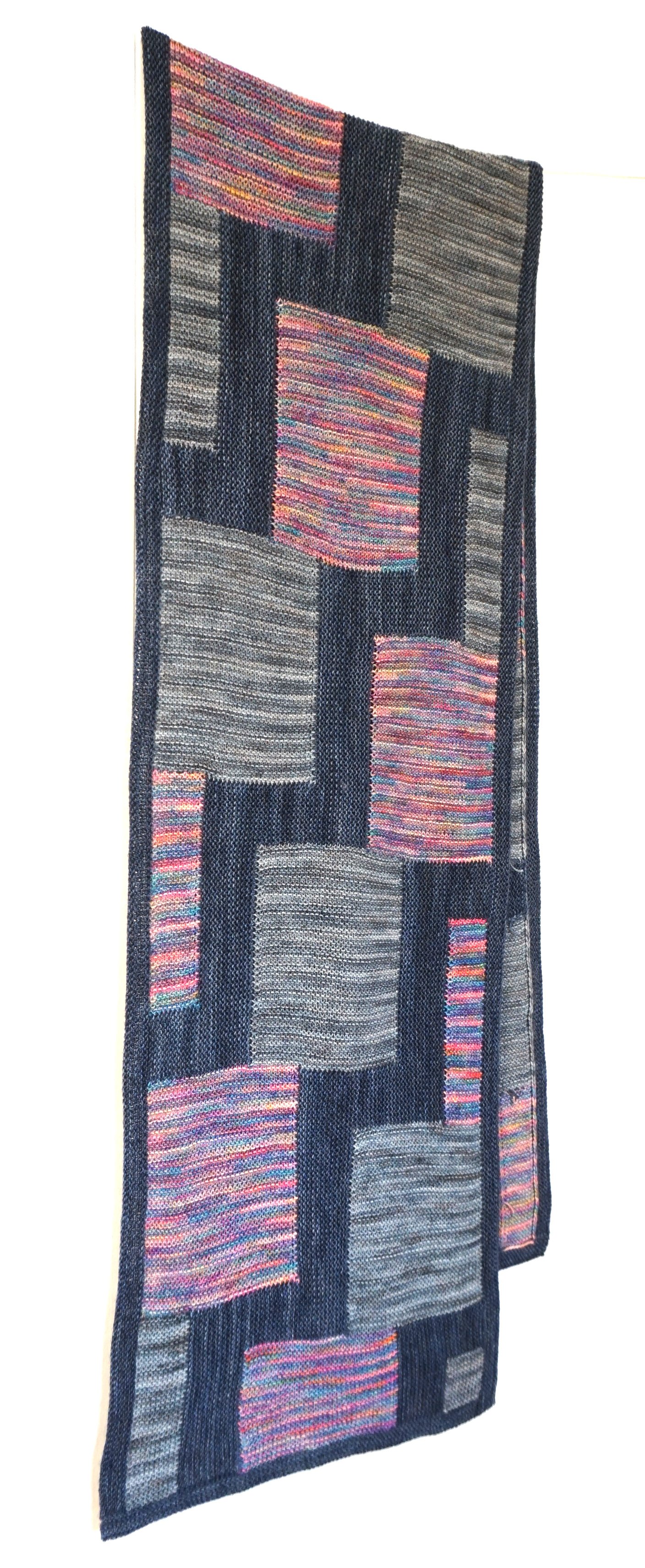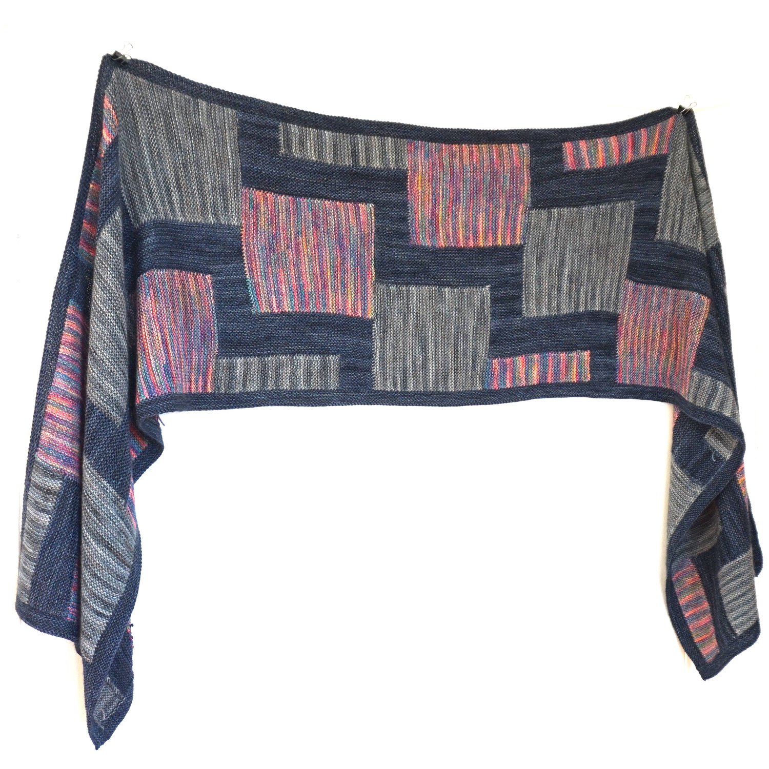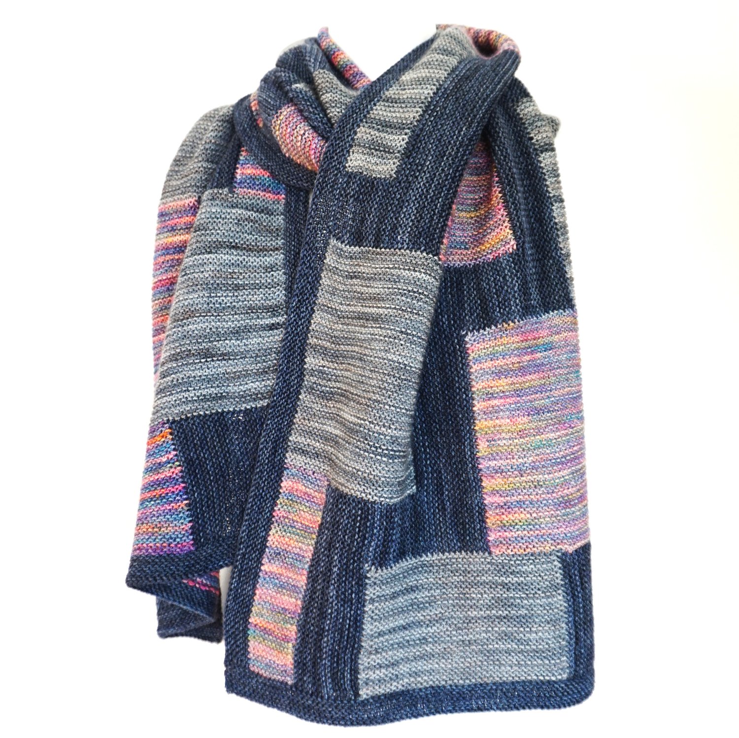 Taking Steps is a modular knit that uses one color at a time. The scarf is worked in garter stitch. Stitches are picked up and joined to the sides of previous blocks to add new sections. After the main part of the scarf is complete, stitches are picked up along each of the sides to add a garter stitch border.