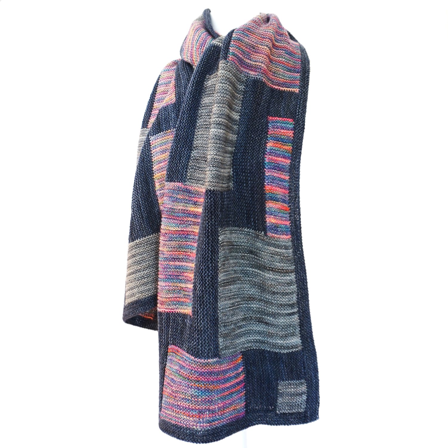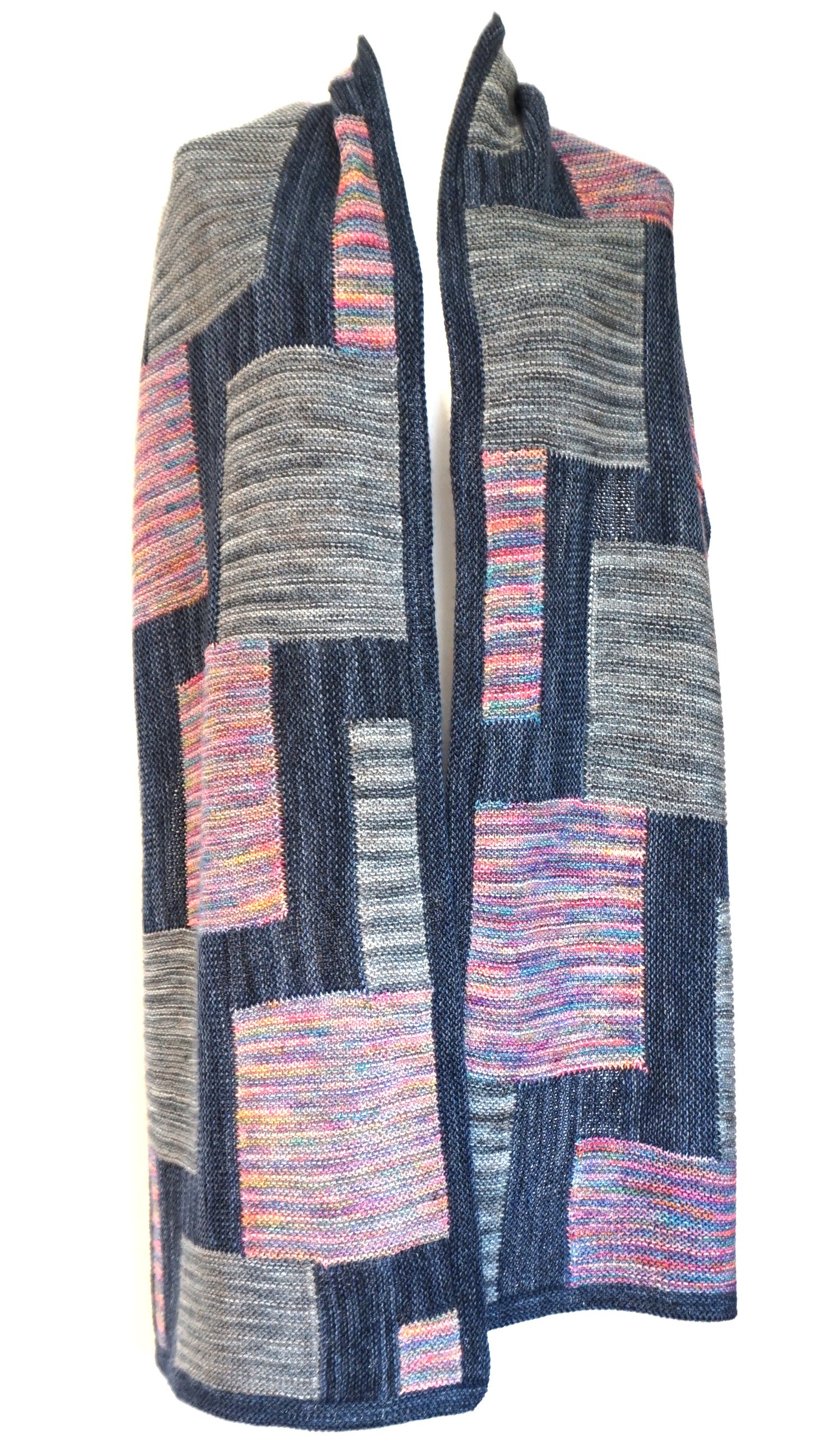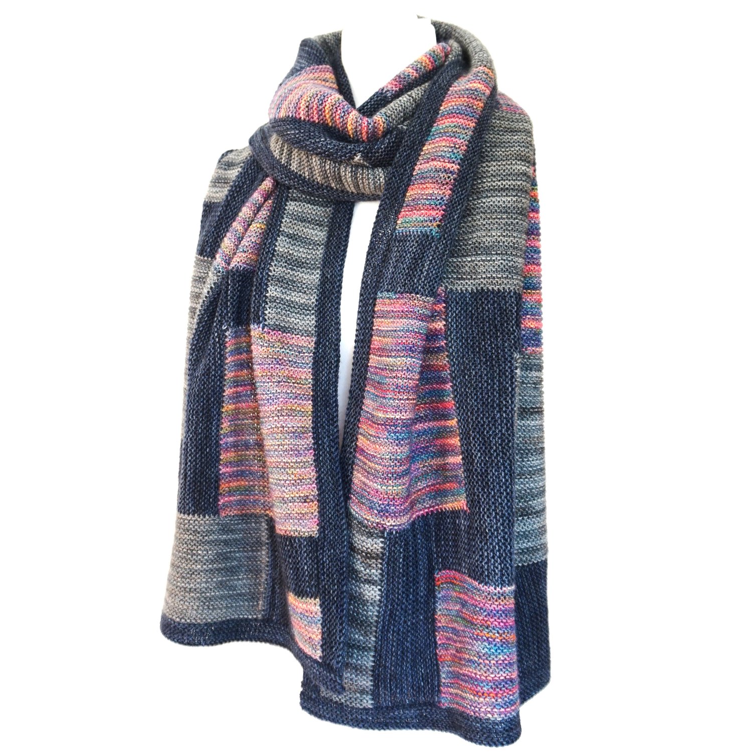 Taking Steps is a modular knit that uses one color at a time. The scarf is worked in garter stitch. Stitches are picked up and joined to the sides of previous blocks to add new sections. After the main part of the scarf is complete, stitches are picked up along each of the sides to add a garter stitch border.