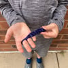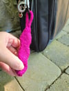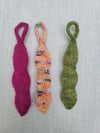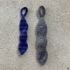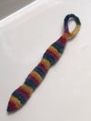Backpack charms and handheld fidget toys are all the rage for my elementary school-aged son and his friends. This knit design combines both! It is a knitted tube of varied width with an enclosed glass marble. Simple icord trim creates a loop to attach the piece to a backpack clip or to place around a finger and hold the toy. The use of a glass marble within soft yarn creates a silent toy that is sure to please students and teachers alike. Experiment with different colors and yarns to reflect your student’s personal style.