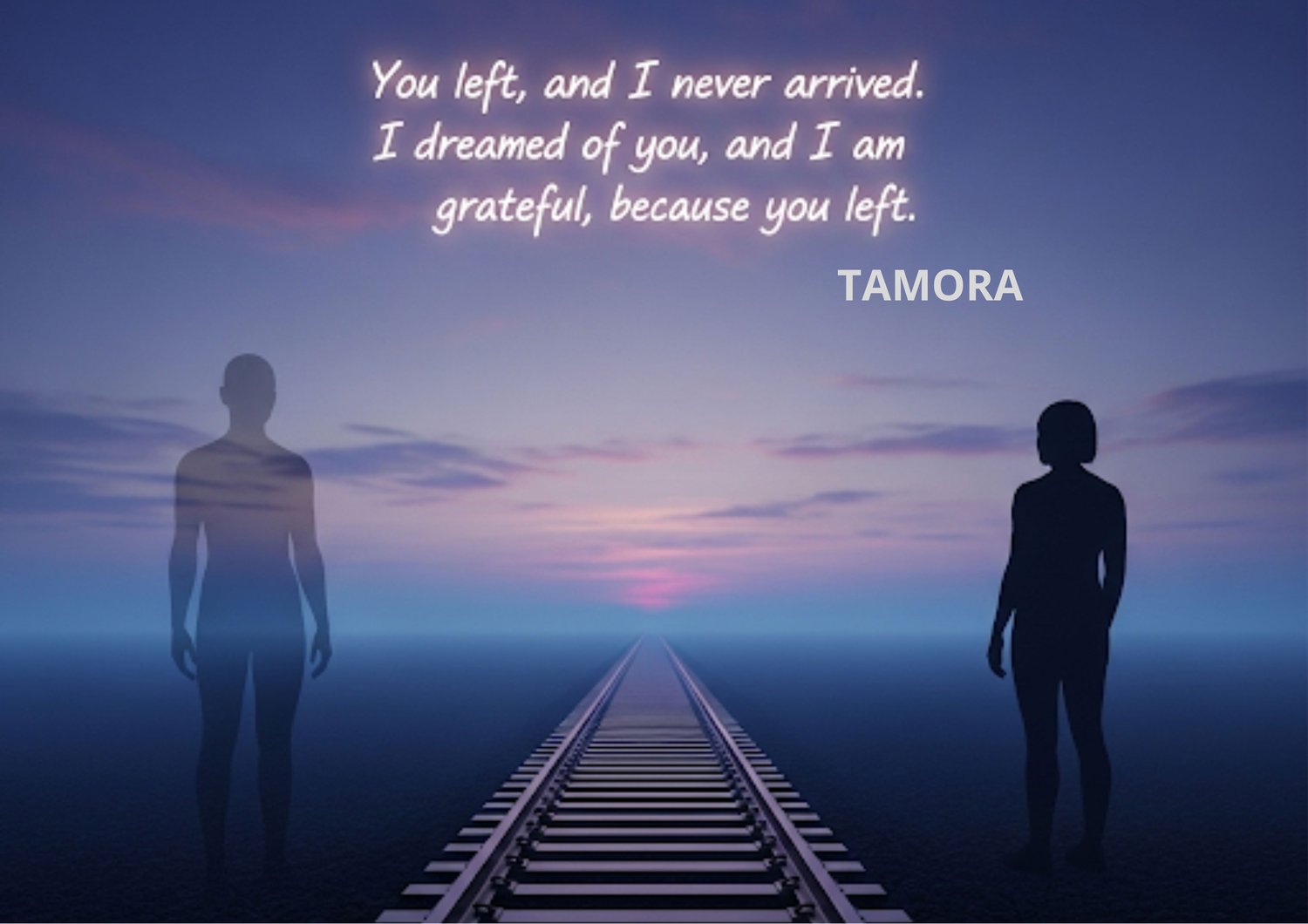 A moving horizontal poetry poster featuring the verses “You left, and I never arrived. I dreamed of you, and I am grateful because you left.” by TAMORA.