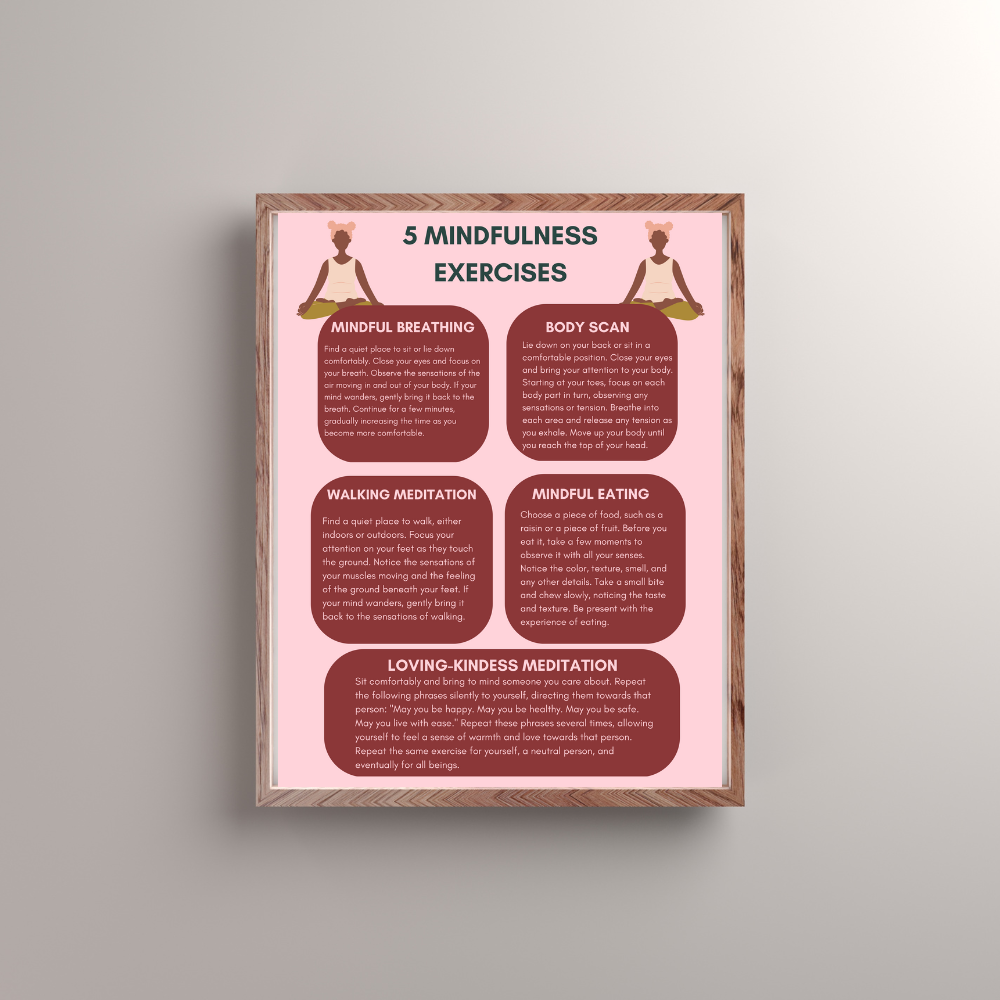 Grab your free printable infographic for Mindfulness Exercises! This 8 x 10 inch guide is designed to help you cultivate mindfulness in your daily life. With a visually appealing layout and easy-to-follow instructions, this infographic includes 5 simple exercises that can be displayed at home or in the office. Whether you're new to mindfulness or looking to deepen your practice, this guide is a great resource for developing a sense of calm and clarity.