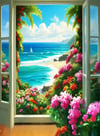 In this peaceful scenery, windows garnished with beautiful flowers open wide to an ocean view in Hawaii. A sailboat is seen in the distance, sailing on turquoise waters across the ocean.