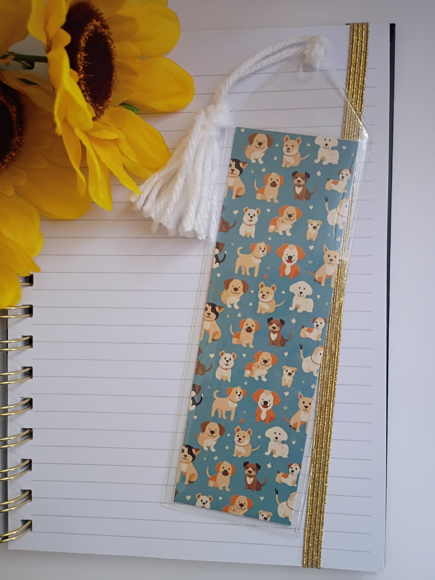 These bookmarks have a different design and pattern on the front and back. The puppies are on the front. They are made from upcycled scrapbook paper and attached to 170 lb. weight cardstock paper for extra stability and firmness.