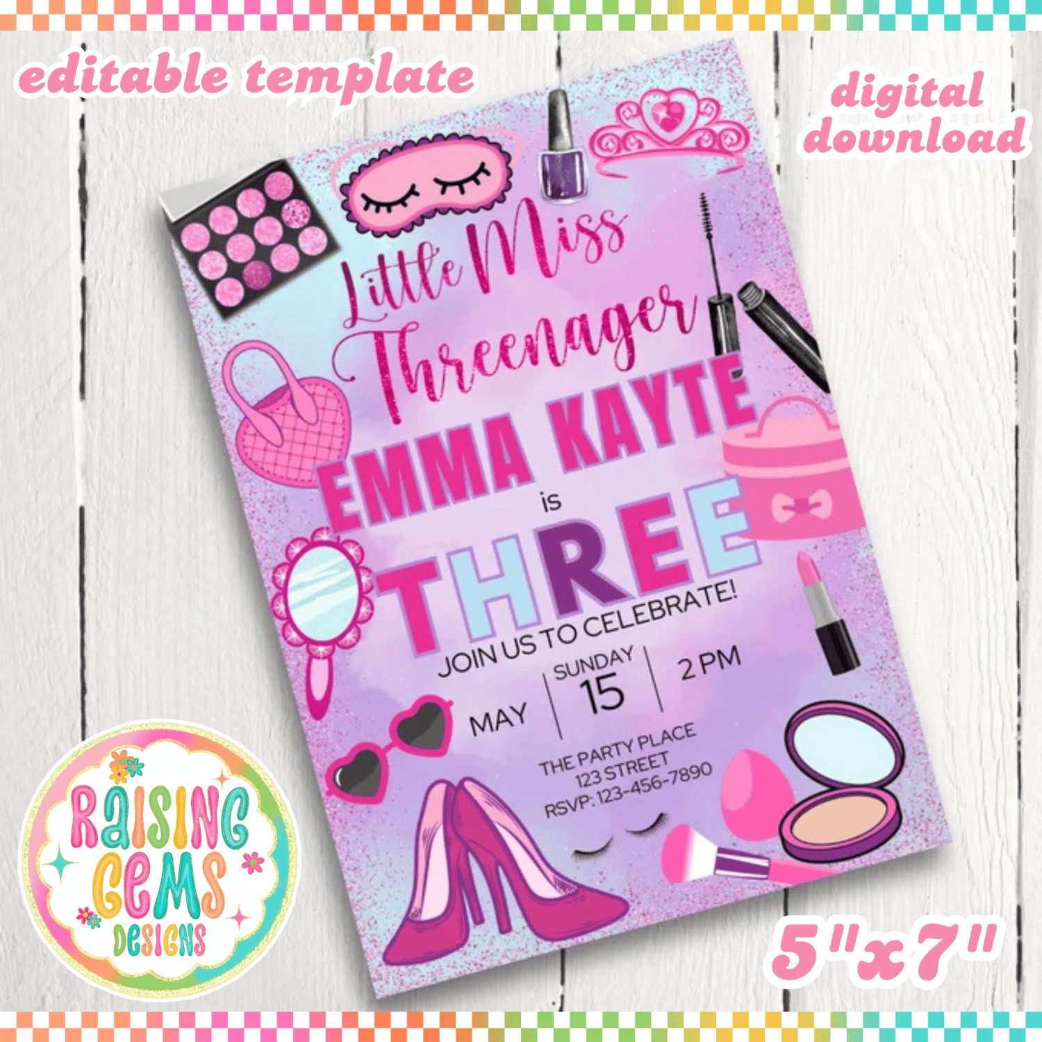Little Miss Threenager party invitation, makeup birthday, spa day invite, three year old birthday party, girl's third birthday, 3rd party