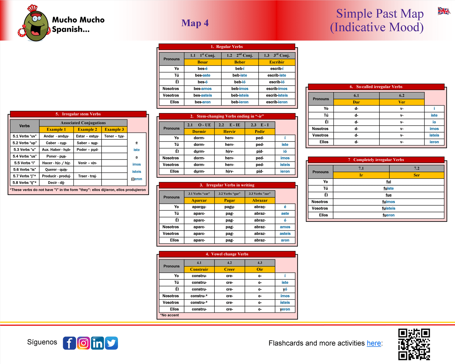 Simple Past Tense (Indicative Mood) - Learn easily how to conjugate all Spanish verbs in the Simple Past with this interactive map. Then you can practice with fun tests. As a bonus flashcards with answers are included for further practice. What are you waiting for to go for the treasure?