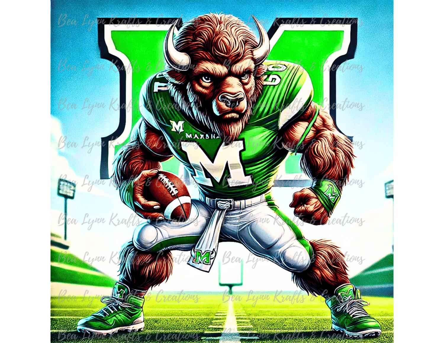 Calling all Thundering Herd fans! Get ready to showcase your Marshall University pride with this high-quality transparent PNG of Marco the Bison, the fierce and iconic mascot of the Herd. This vibrant, detailed design features Marco in the bold green and white team colors, making it the perfect addition to any fan's collection!