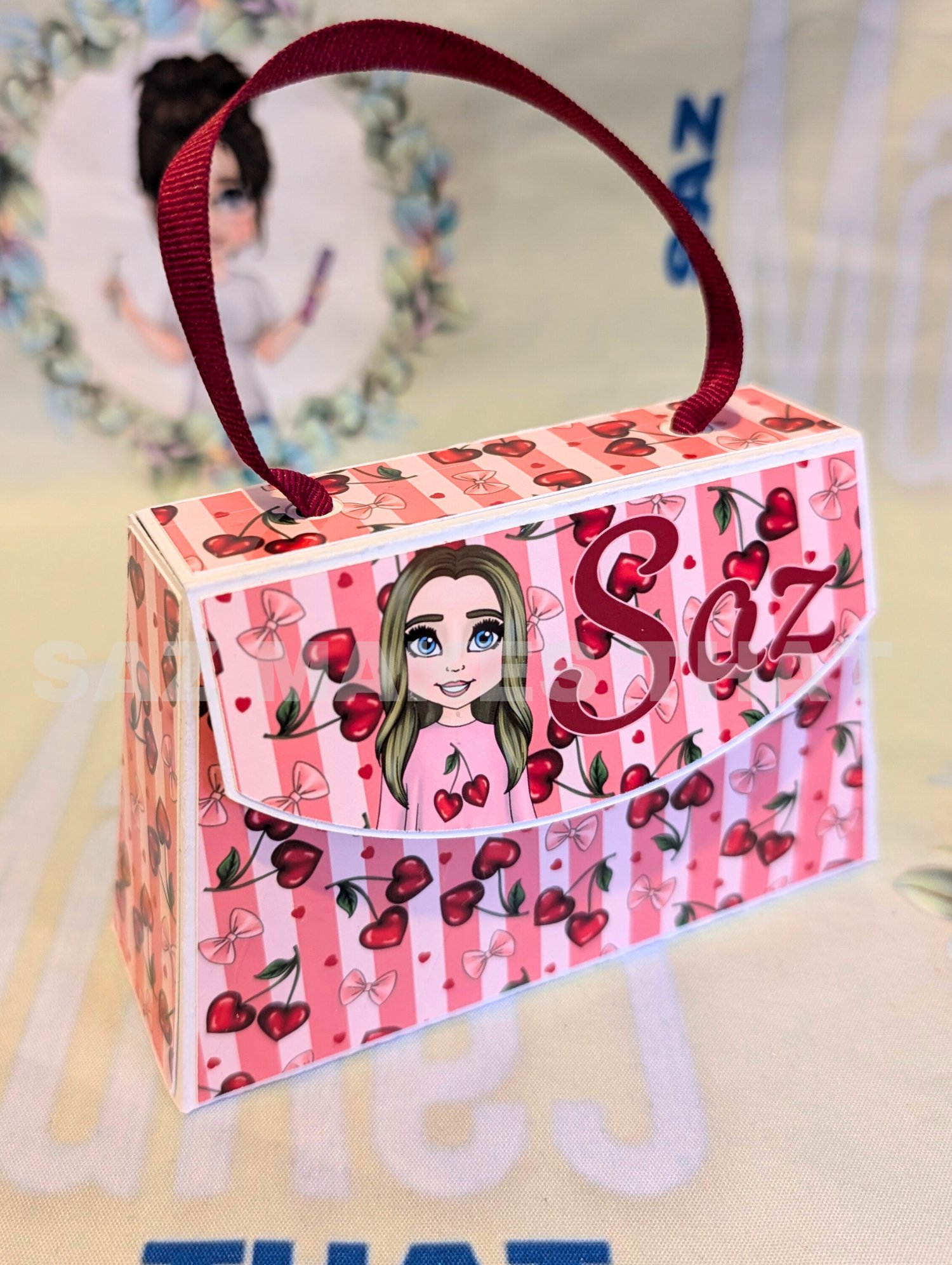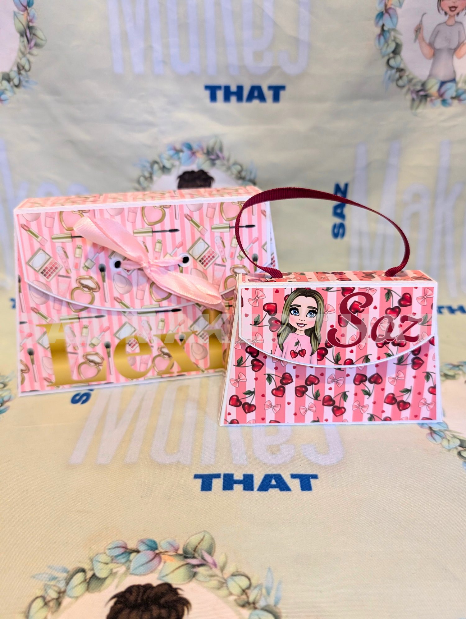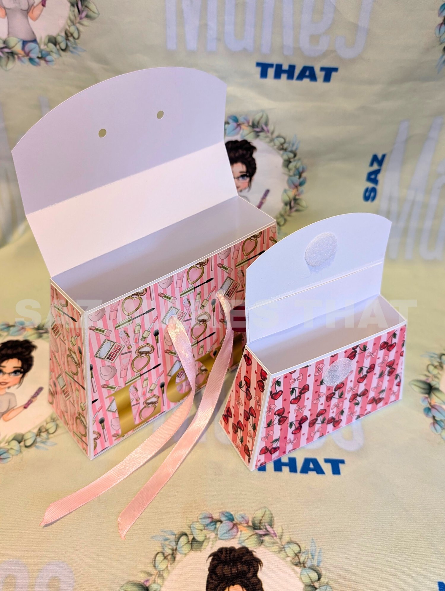 the file includes a small and medium bag with 4 options for each size for different ribbon handle and closures that you can personalise with images and text for print then cut or just cut from plain or patterned card.