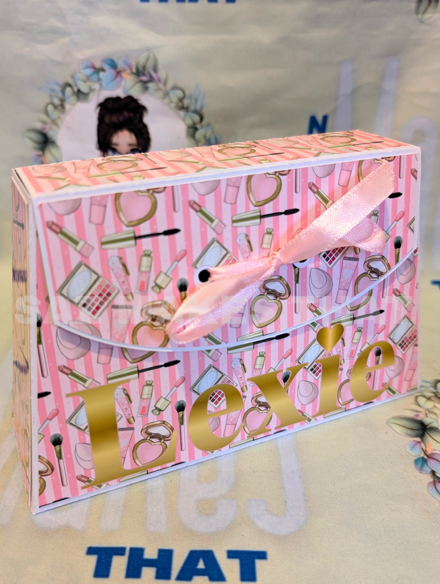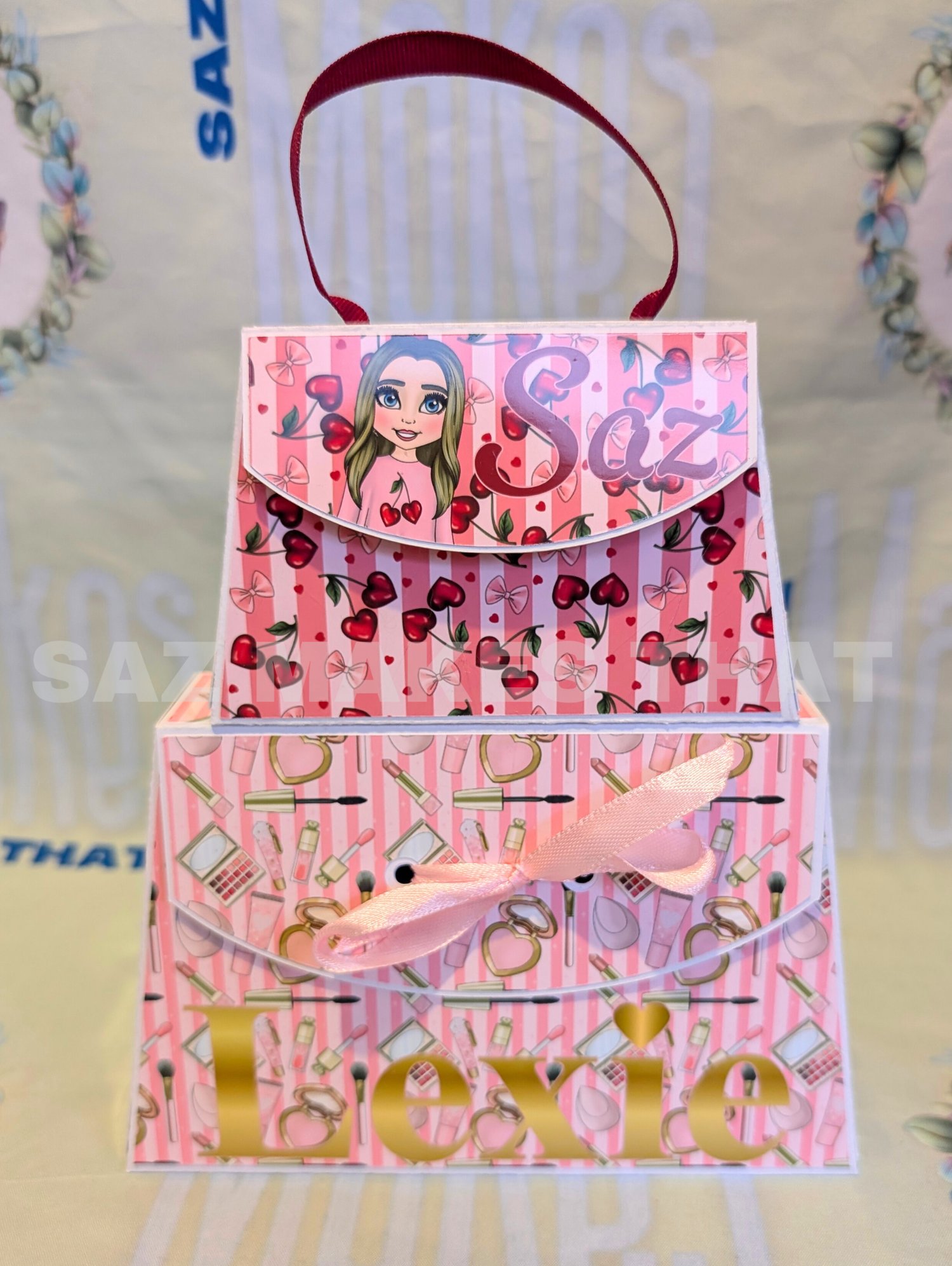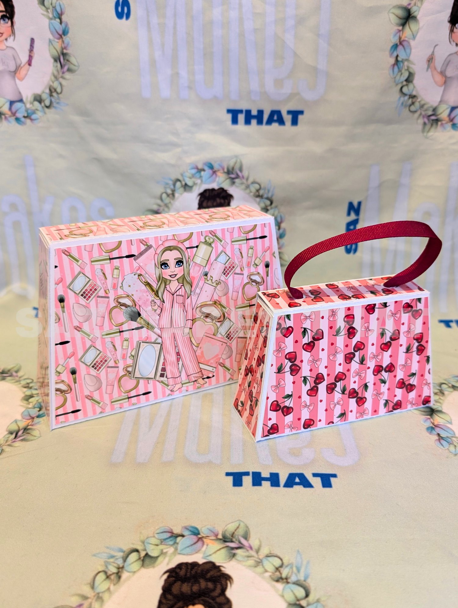 the file includes a small and medium bag with 4 options for each size for different ribbon handle and closures that you can personalise with images and text for print then cut or just cut from plain or patterned card.