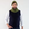 Bands of knitted herringbone stitch on a stockinette field give a nod to the woven twill fabric of a classic sport coat. Knit up in Haven, this fitted cap and matching cowl make a luxuriously cozy set.