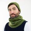 Both the cowl and the cap are worked in the round. The nature of herringbone stitch requires it to be knit using a significantly larger needle to match the gauge of stockinette stitch, so needle sizes change regularly throughout the work.