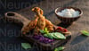 Delicious fried chicken and rice on wooden plate
