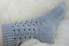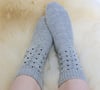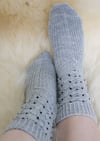 The gauge for the socks is 9 stitches per inch and 11 rows per inch. Socks are knit from the top down.
