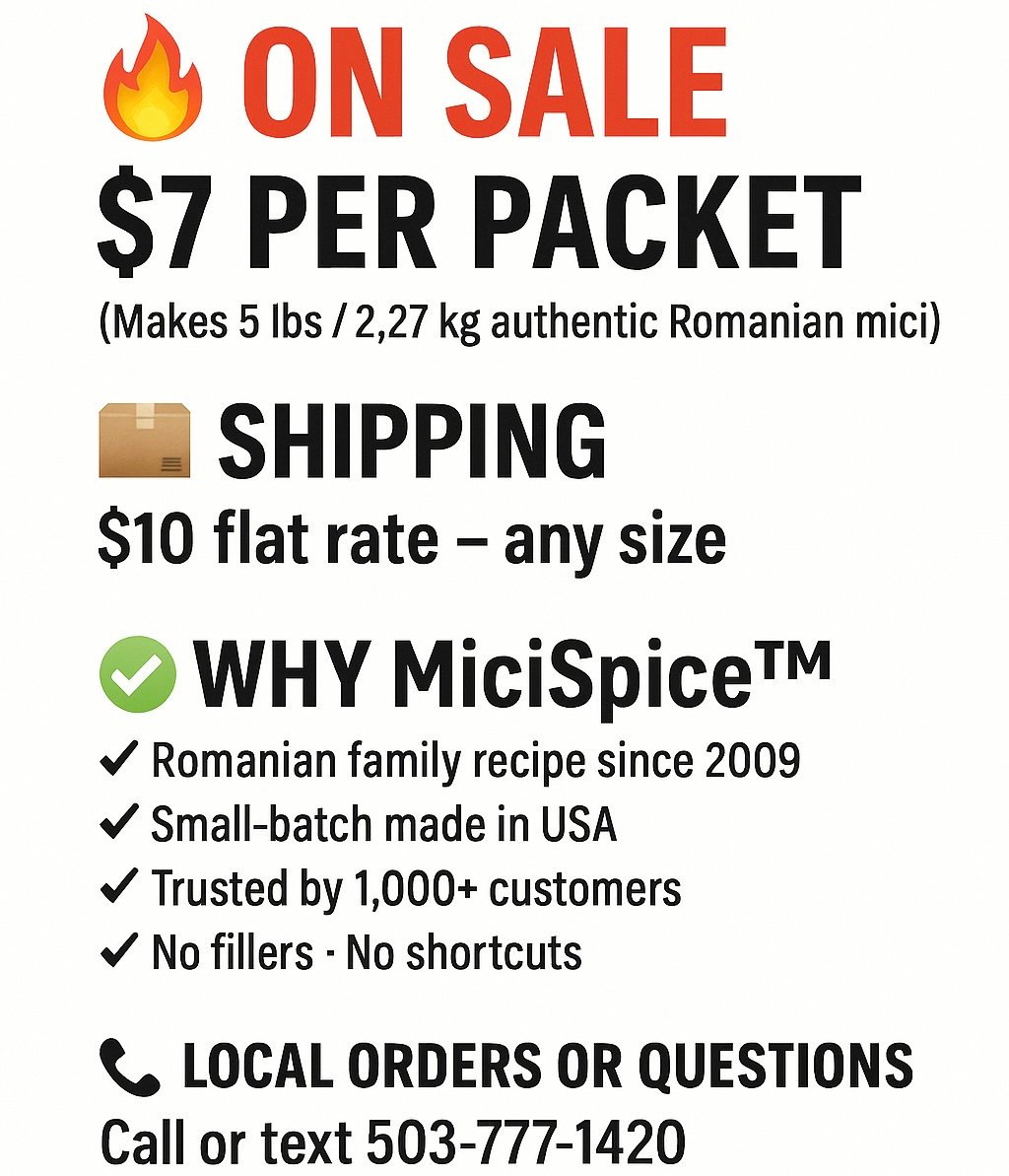 This spice mix is amazing! It tastes just like the mici I grew up with in Romania—juicy, flavorful, and perfectly balanced. No guessing, no extra ingredients—just mix it in and you’re ready to go. Everyone loved them, and they couldn’t believe they were homemade. I’ll definitely be ordering more. Highly recommend for anyone who wants authentic mici without the hassle!