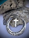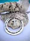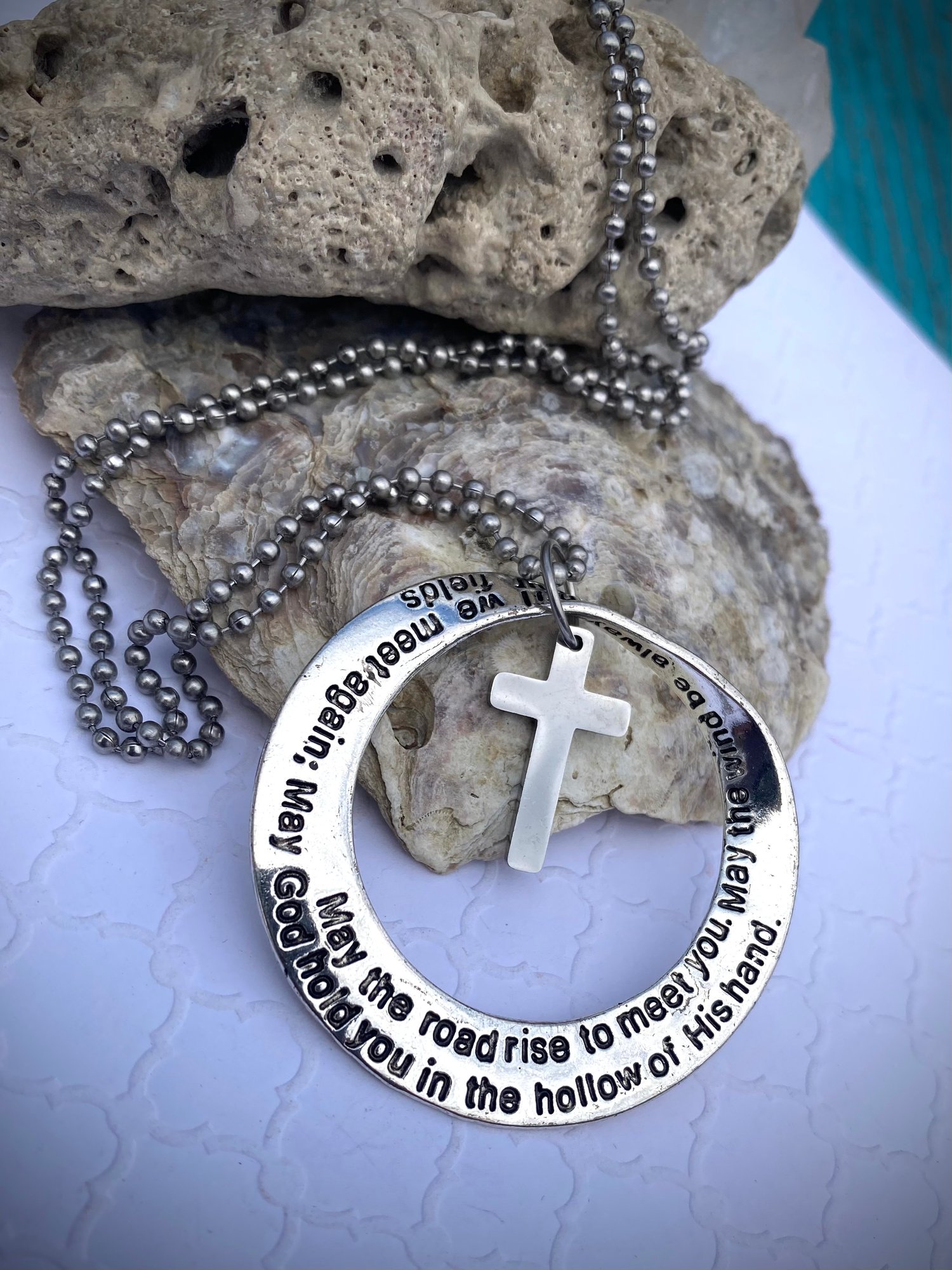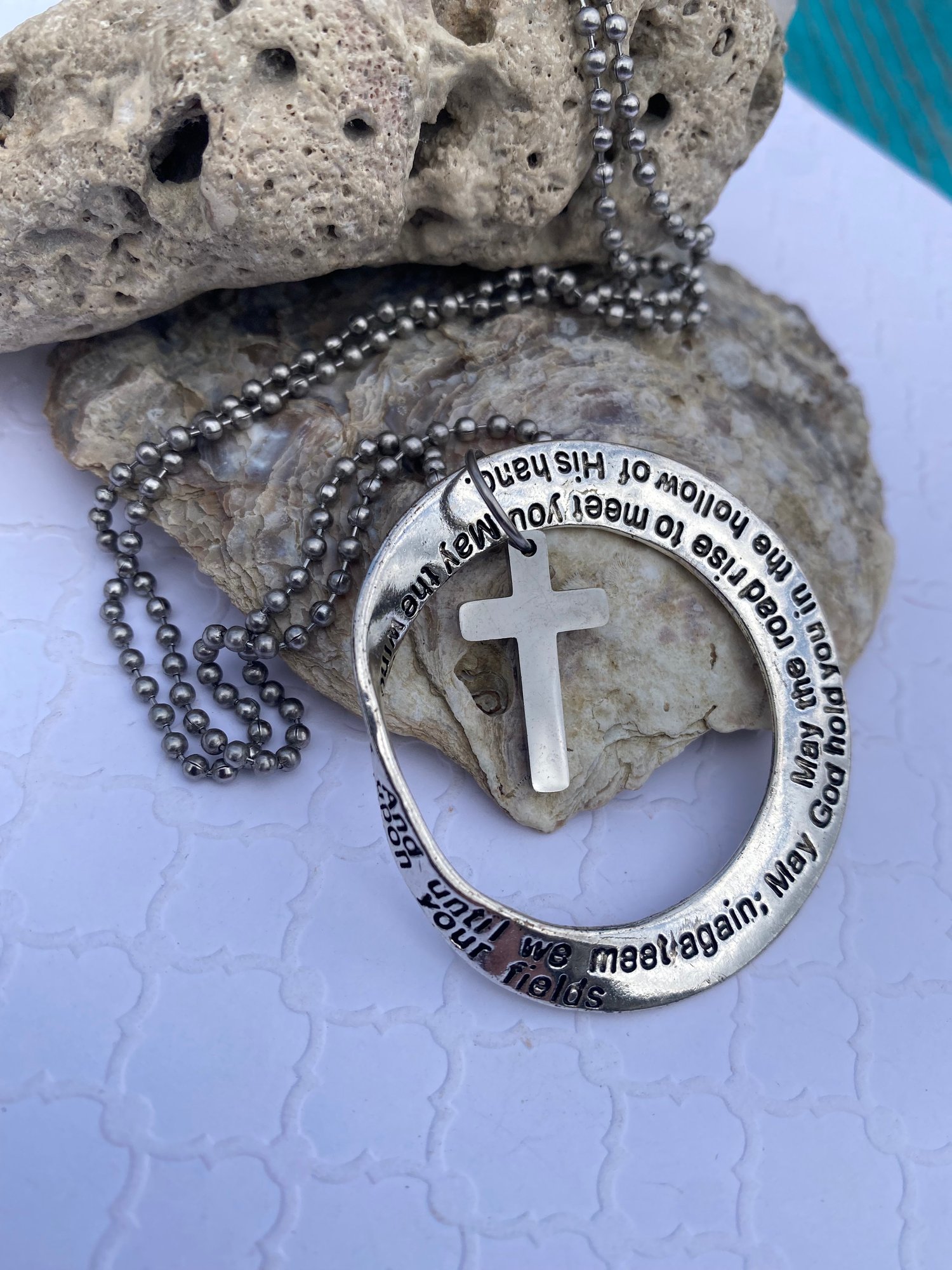 Stylish and bold, this pendant is a fashionable testament of Faith. Silver toned metal pendant stamped with parts the Irish Blessing on both sides. Silver toned metal Cross separately attached in center of the pendant. super sturdy stainless steel ball chain which comes 24" in length as shown or choose a custom option size in listing.