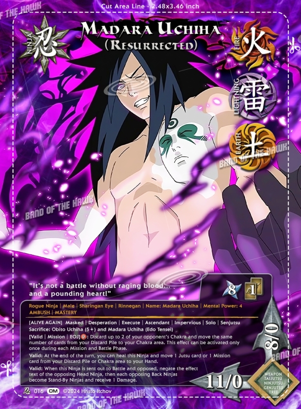 n016 - Madara Uchiha (Resurrected) Promo Ninja card from our Obito & Madara card set for Naruto CCG.