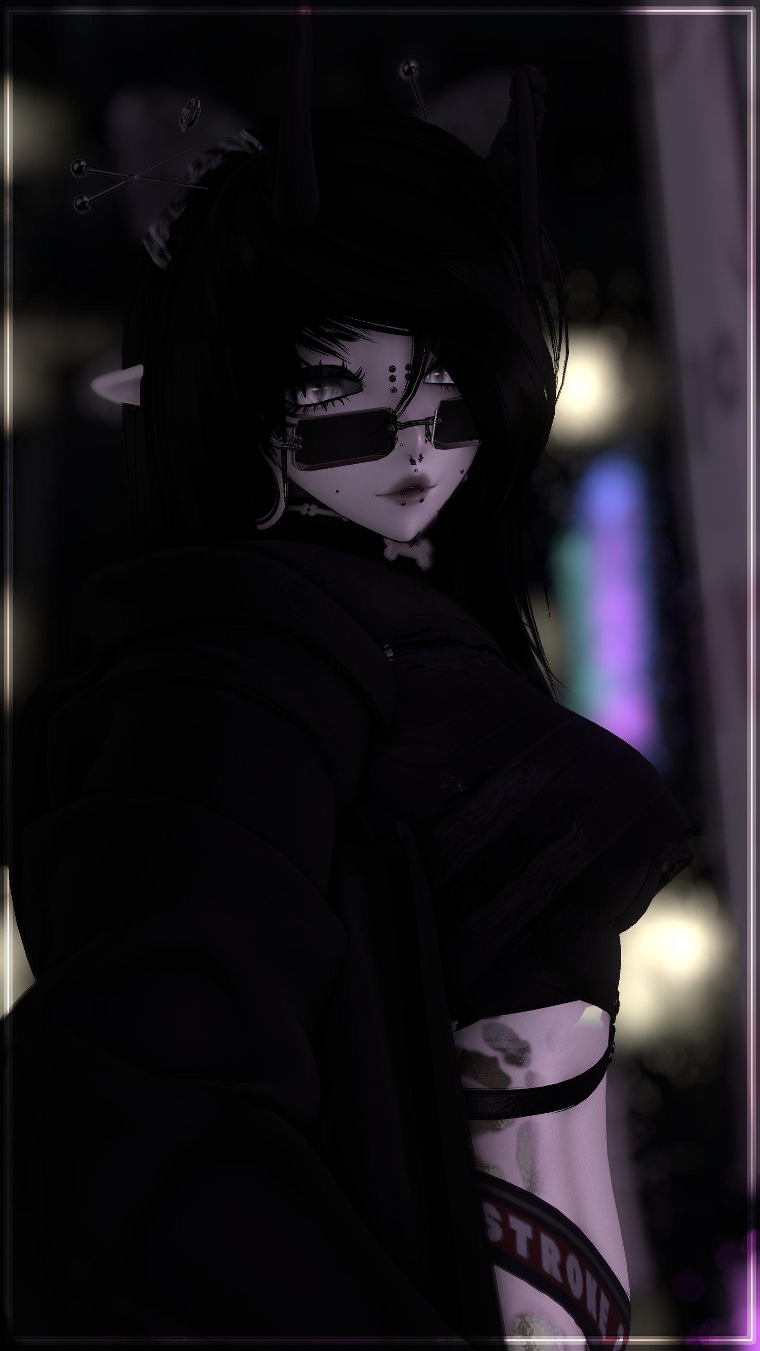 Arm Wraps :: Michaelstl - Vena Comfy Wear | Choker :: Cupkake - Accessory Pack | Harness :: Petty - Bat Harness | Horns :: Eggly - Millim Broken Horns | Kneepads :: Jule3D - Kneepads | Rings :: Zinpia - Halloween Nails | Mask :: Wen - Nitro Mask | Glasses :: Hayweee - Sunglasses | Piercings :: Ms. Nebula - Nebs Piercing Set