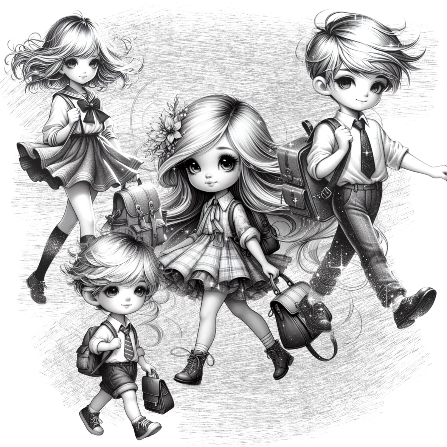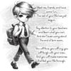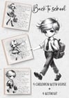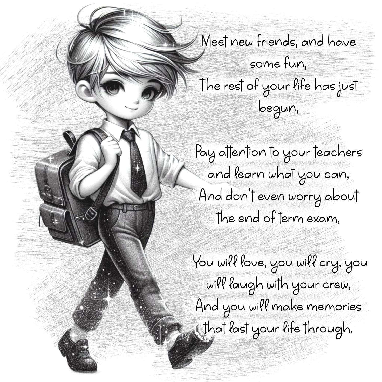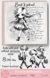 First day/Back to school. Older and younger boy, girl, with and without exclusive handwritten verse, copyrighted to me. You will receive 8 transparent PNG files; complete designs; older and younger boys with text and hatched background; older and younger girls with text and hatched background - ideal for greetings cards etc. You will also receive all 4 girls and boys with no background and no text to use on other end products such as clothing, mugs etc.