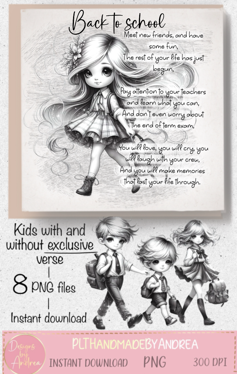 First day/Back to school. Older and younger boy, girl, with and without exclusive handwritten verse, copyrighted to me. You will receive 8 transparent PNG files