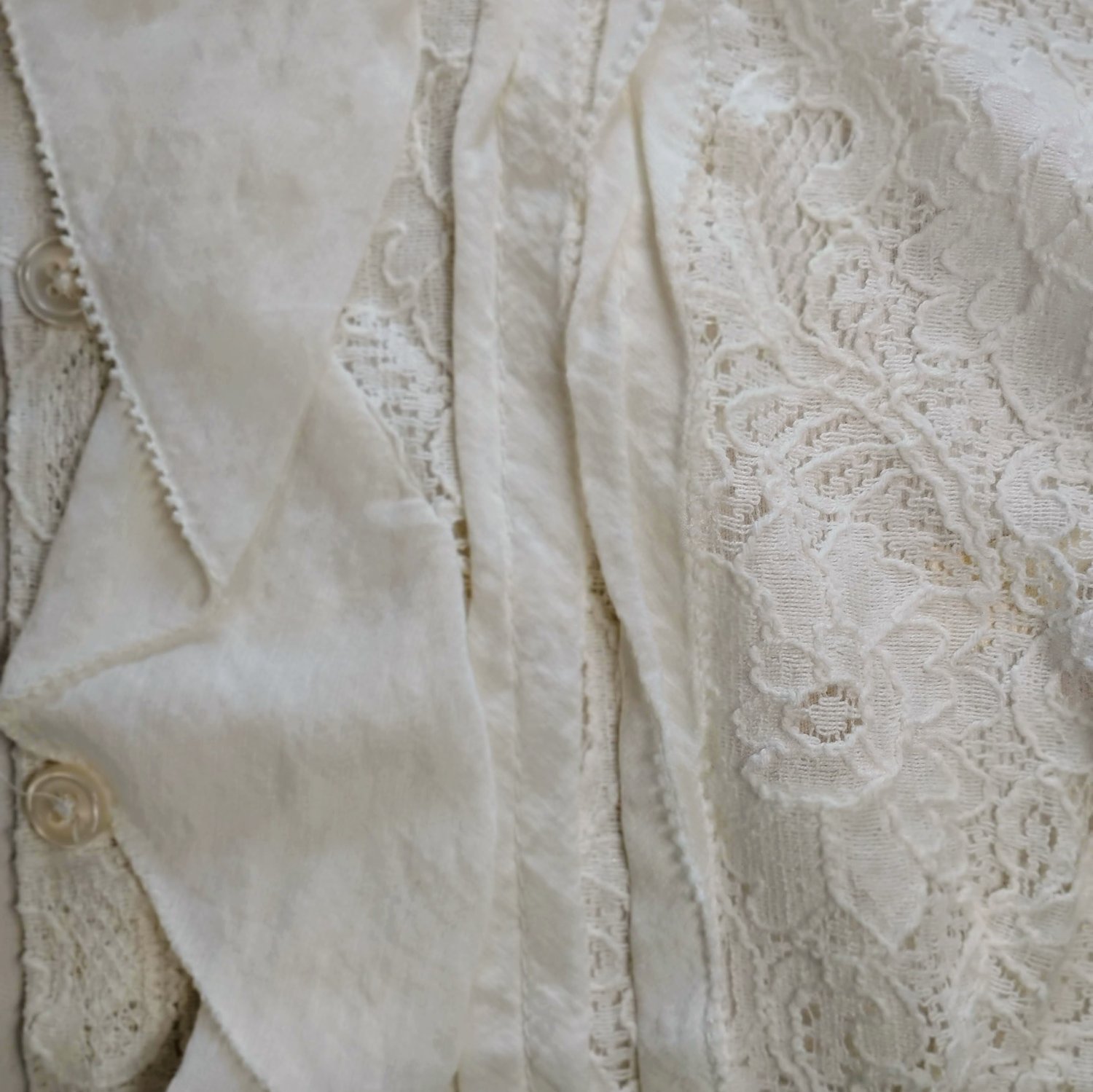 A soft and pliable piece of slightly off-white, cream floral lace.