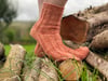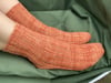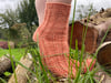 Light lace socks inspired by hopeful daydreams of a warm summer with an easy lace rib pattern which quickly becomes memorised. The wrap and turn short row heel technique can be a little bit fiddly but it’s easy once you get going, and creates a neat heel.