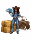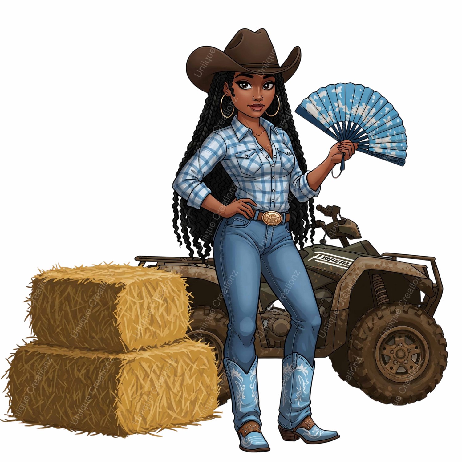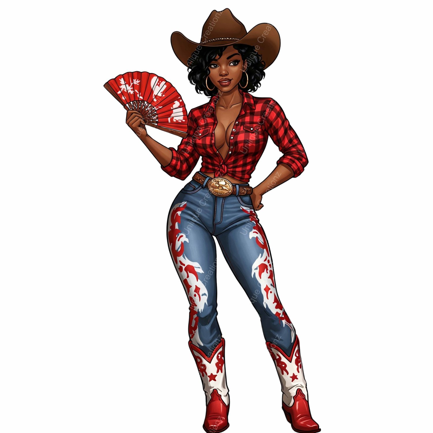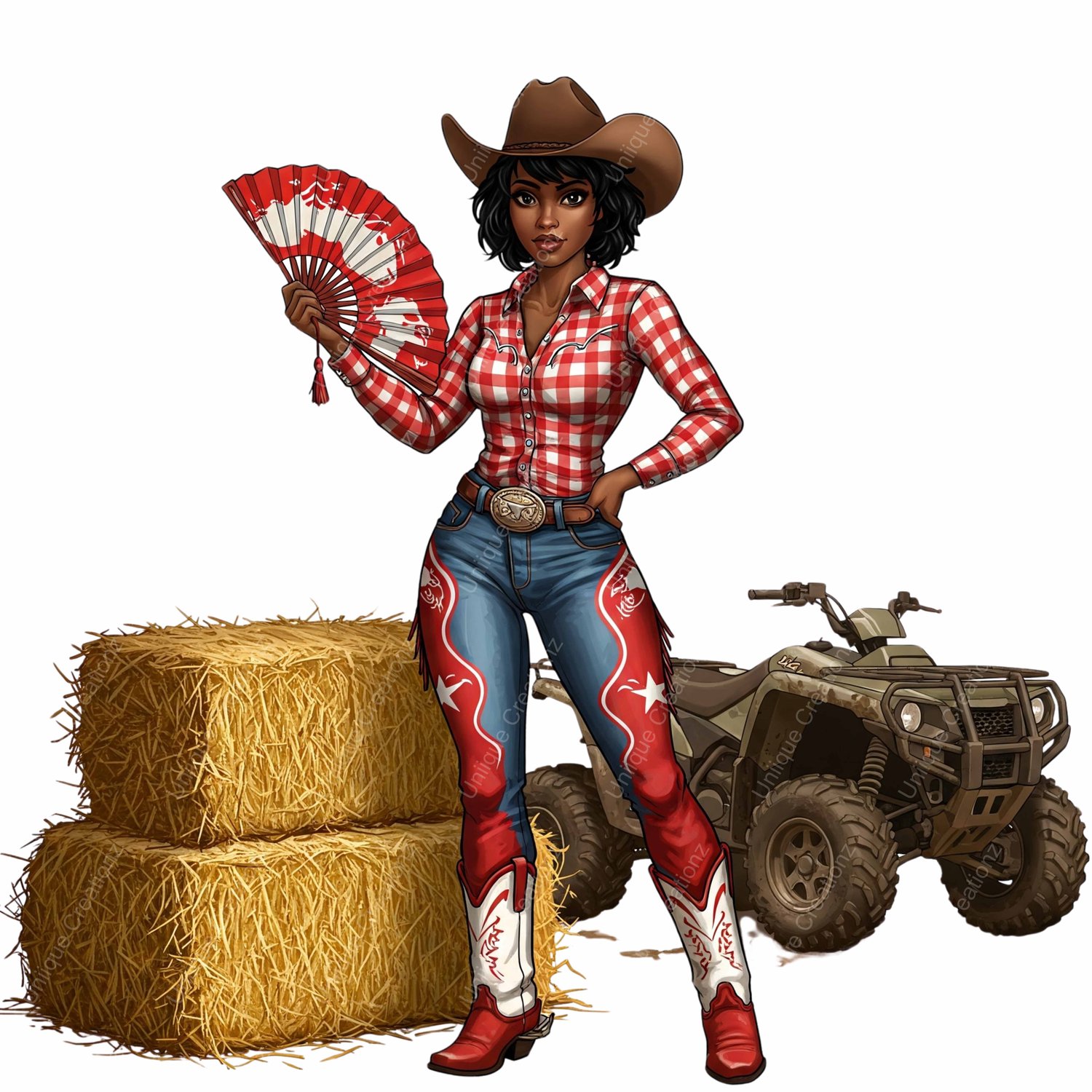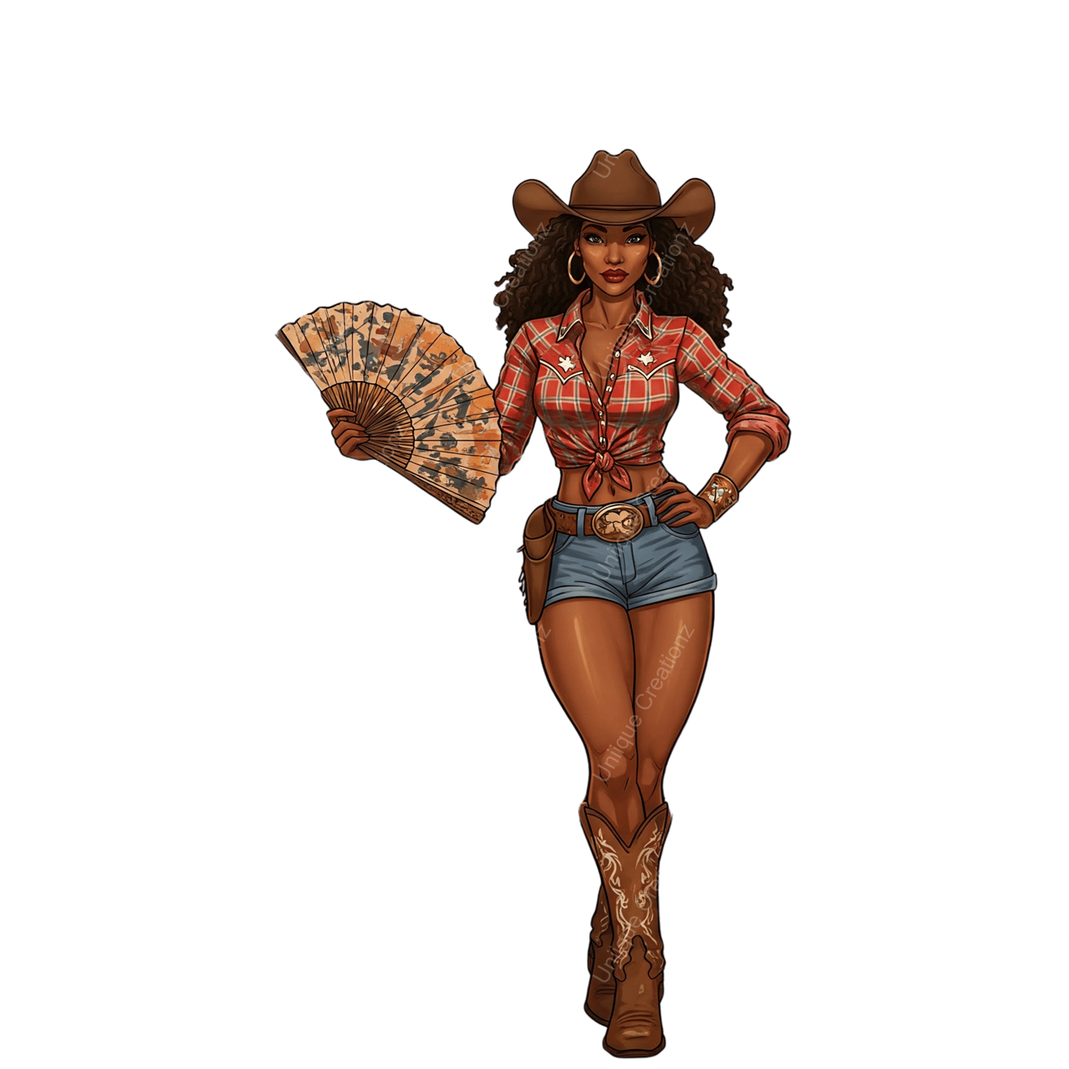 Variety of Transparent High Quality Pngs featuring various Cow Girls holding their "Clack" Fans. Some images have Text which can be erased or removed if desired for design purposes using your favorite graphics program such as Canva. 17 different images included!