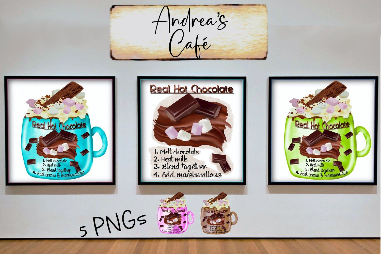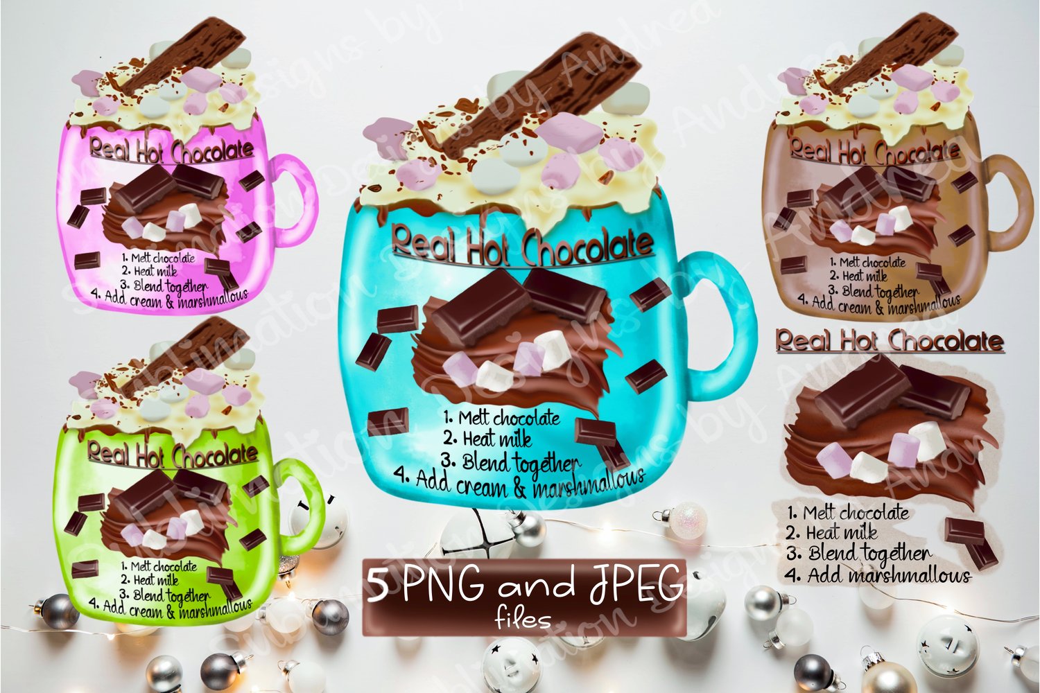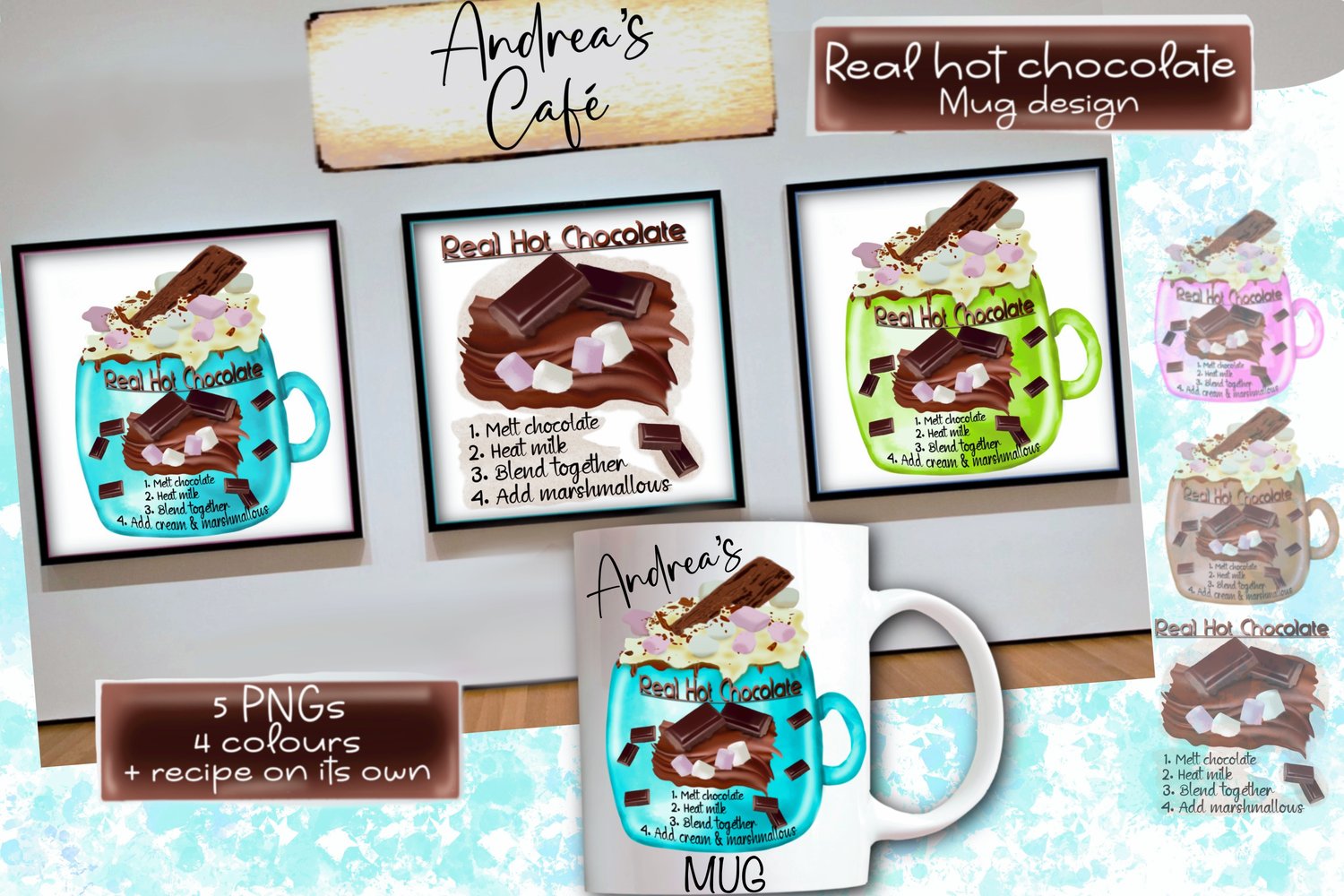 Hand painted 'Real hot chocolate' recipe on a hand painted watercolour mug with whpped cream and chocolate flake. 4 different mug colours included, plus the recipe on its own for you to use on its own.