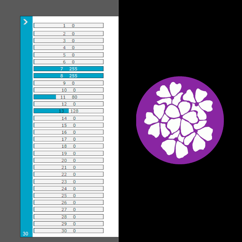 * Verifique que coincidan estos canales: 8 Dimmer, 7 Strobo/Shutter, 11 en el valor 80 = Gobo de Flores con fondo Violeta, 13 Foco (ver tercer foto).