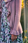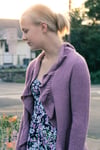 Plixi is a long and lean open front cardigan, with gentle waist shaping and a flowing ruffle at the front edge and cuffs. Worked seamlessly from the top down in a drapey fingering weight yarn on larger needles, Plixi uses the contiguous method of seamless shoulder and sleeve construction, with a picked-up ruffle along the front edge, and a simple purled hem finish. Long, slim, and elegant, Plixi works with jeans or a dress, for a sleek and chic style to elevate any outfit.