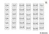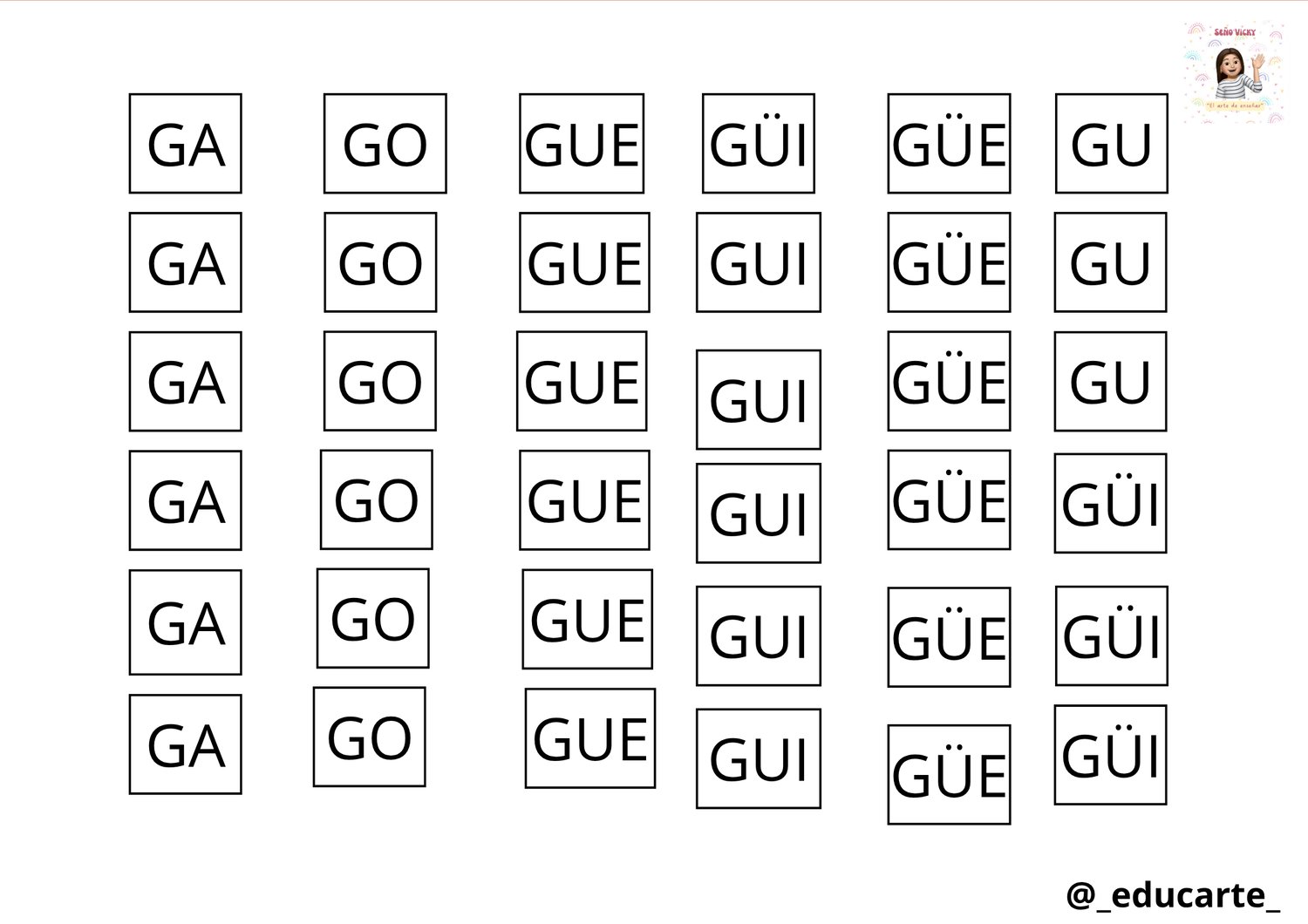 Este material está pensado para que los peques practiquen la escritura de palabras que contienen las sílabas ga, go, gu, gue, gui, güe y güi, asociándolas con su imagen y completándolas correctamente.