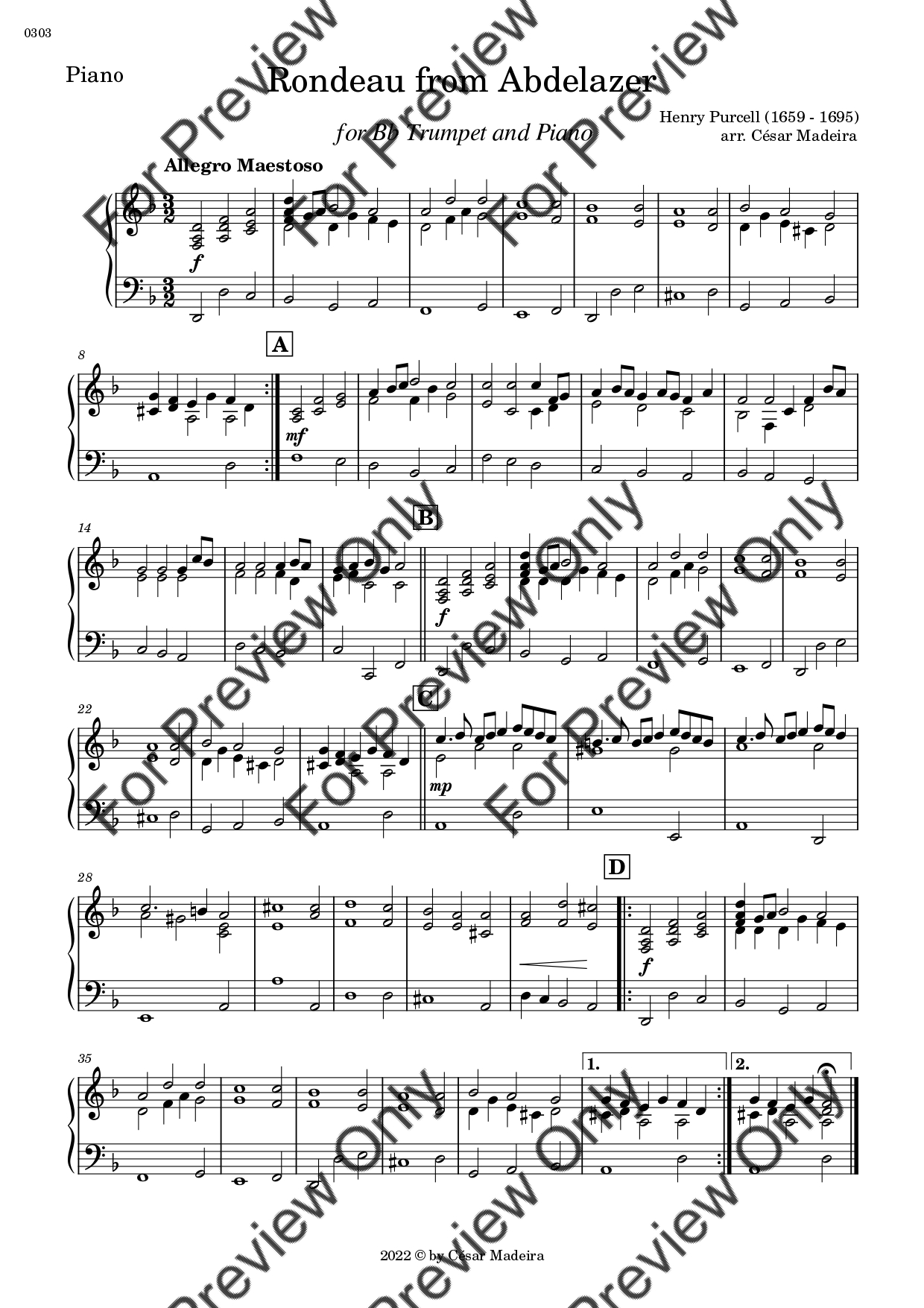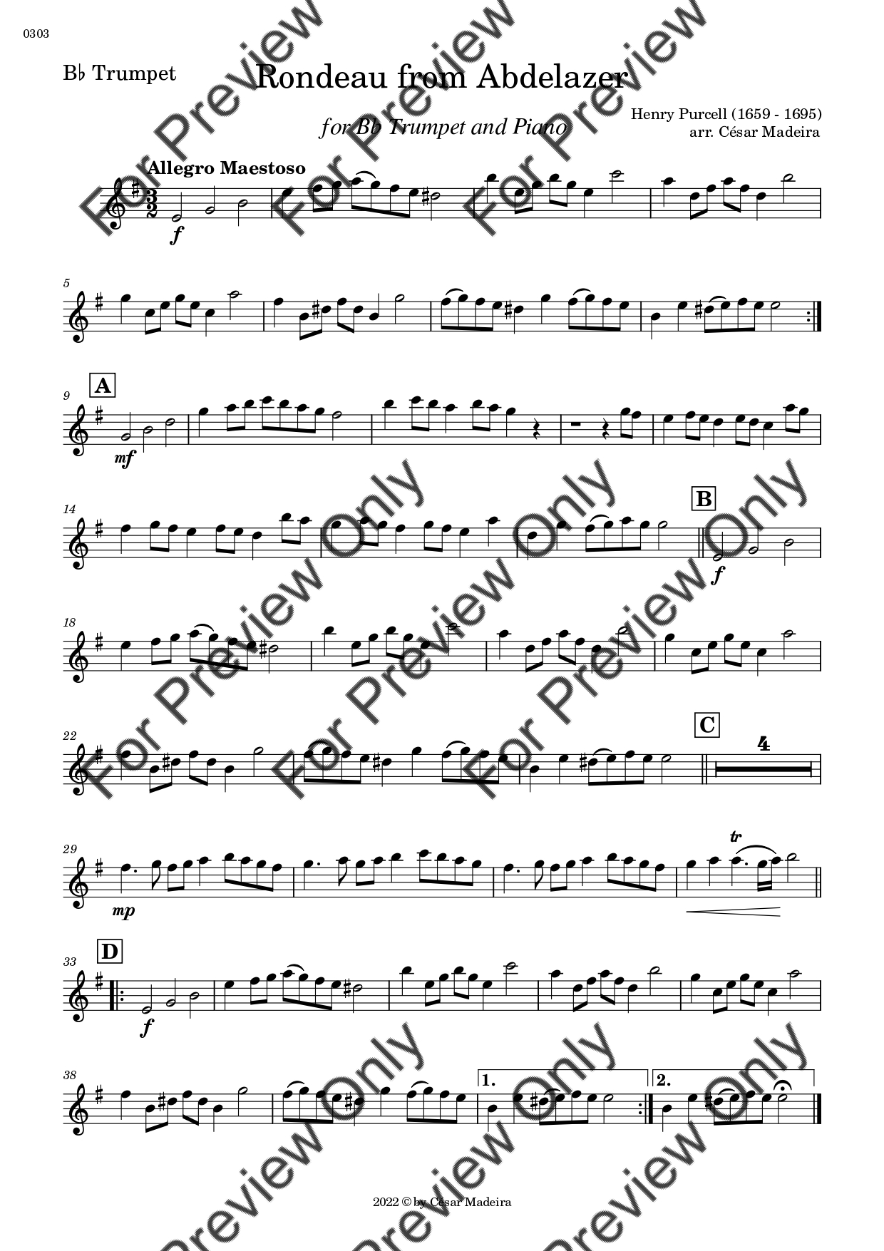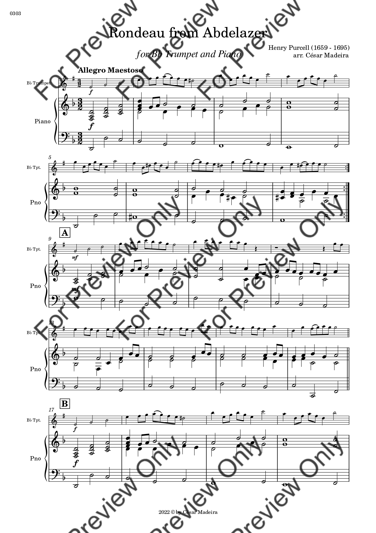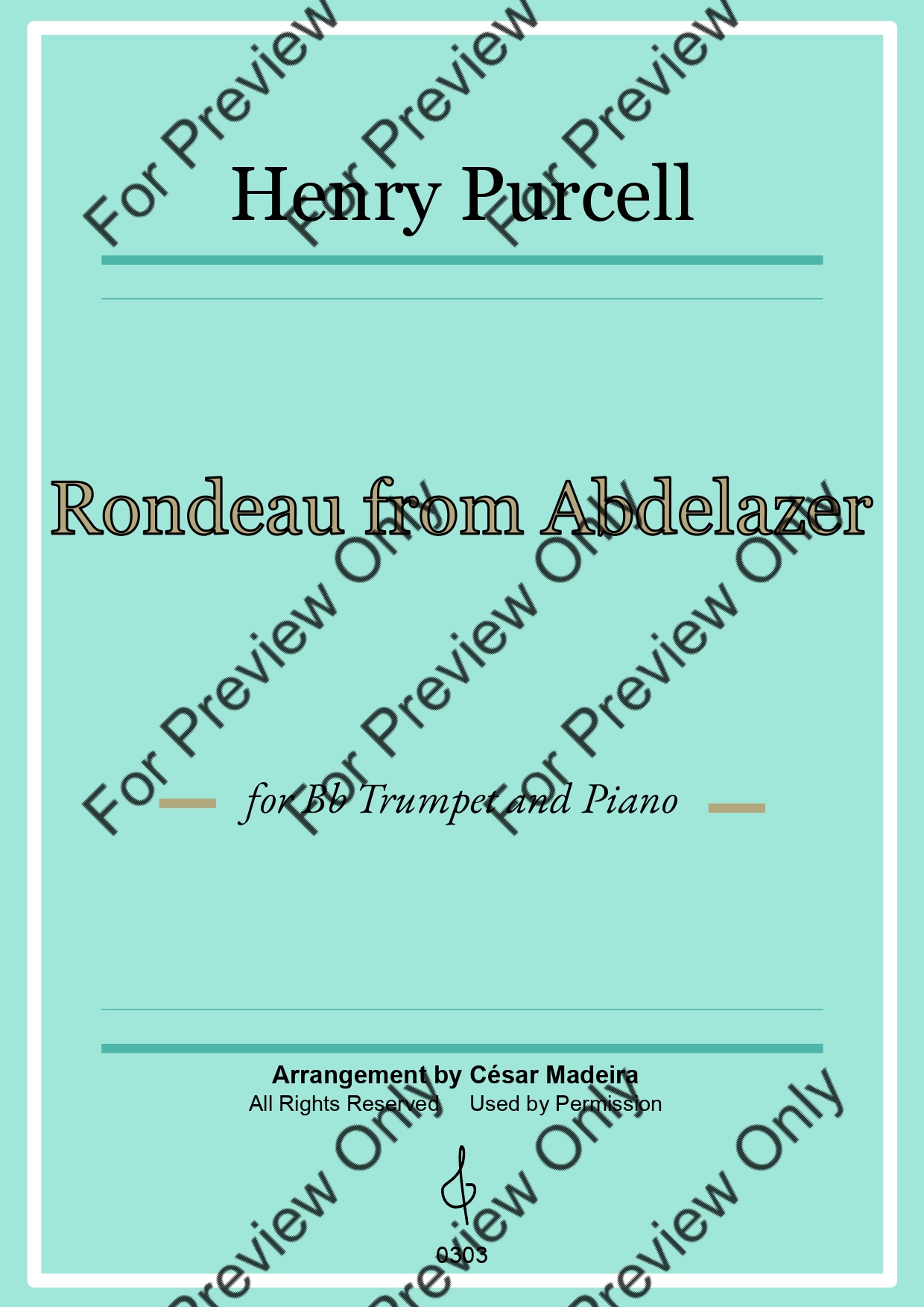 Rondeau from Abdelazer by Georg Friedrich Handel. Arrangement for Bb Trumpet and Piano. With Full Score and Individual Parts. Have fun!