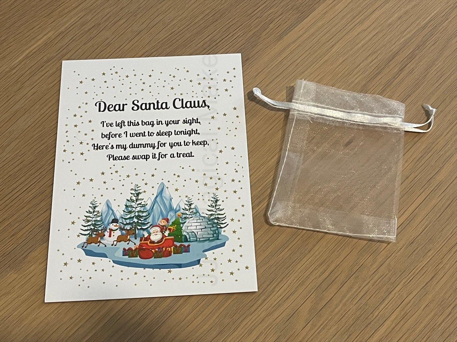 Dummy fairy print with organza bag. Great way to help your little one give up their dummy at christmas. Theres are A6 in size.