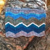 The chevron pattern is worked in colours that look like the transition from the ocean to the land and then to the sky. Starting with the deep blue ocean, which changes colour as it nears the land, to the white breakers against the rocks, the brown/green landmass of the point itself and then finally up into the vast African sky above. The pattern suggests specific colours and numbers of rows per colour, but feel free to improvise your own colour changes or use a self-striping yarn.