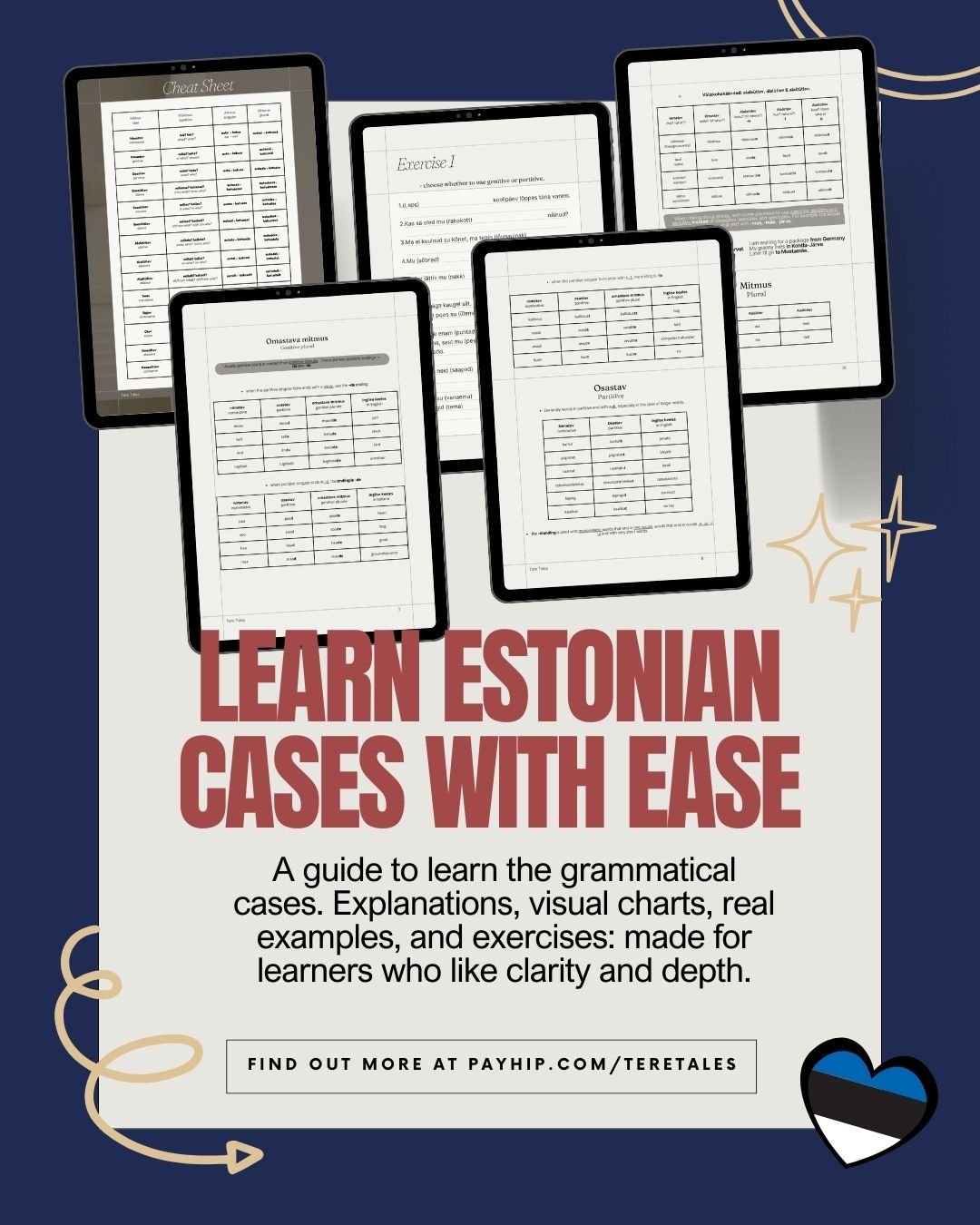 24 pages dedicated exclusively to learning Estonian grammatical cases! If you've already started learning Estonian, you know that cases are the most difficult and boring part to understand. That's why I've created a PDF with charts, explanations, and exercises to make this process easier. Learn Estonian grammatical cases easily!