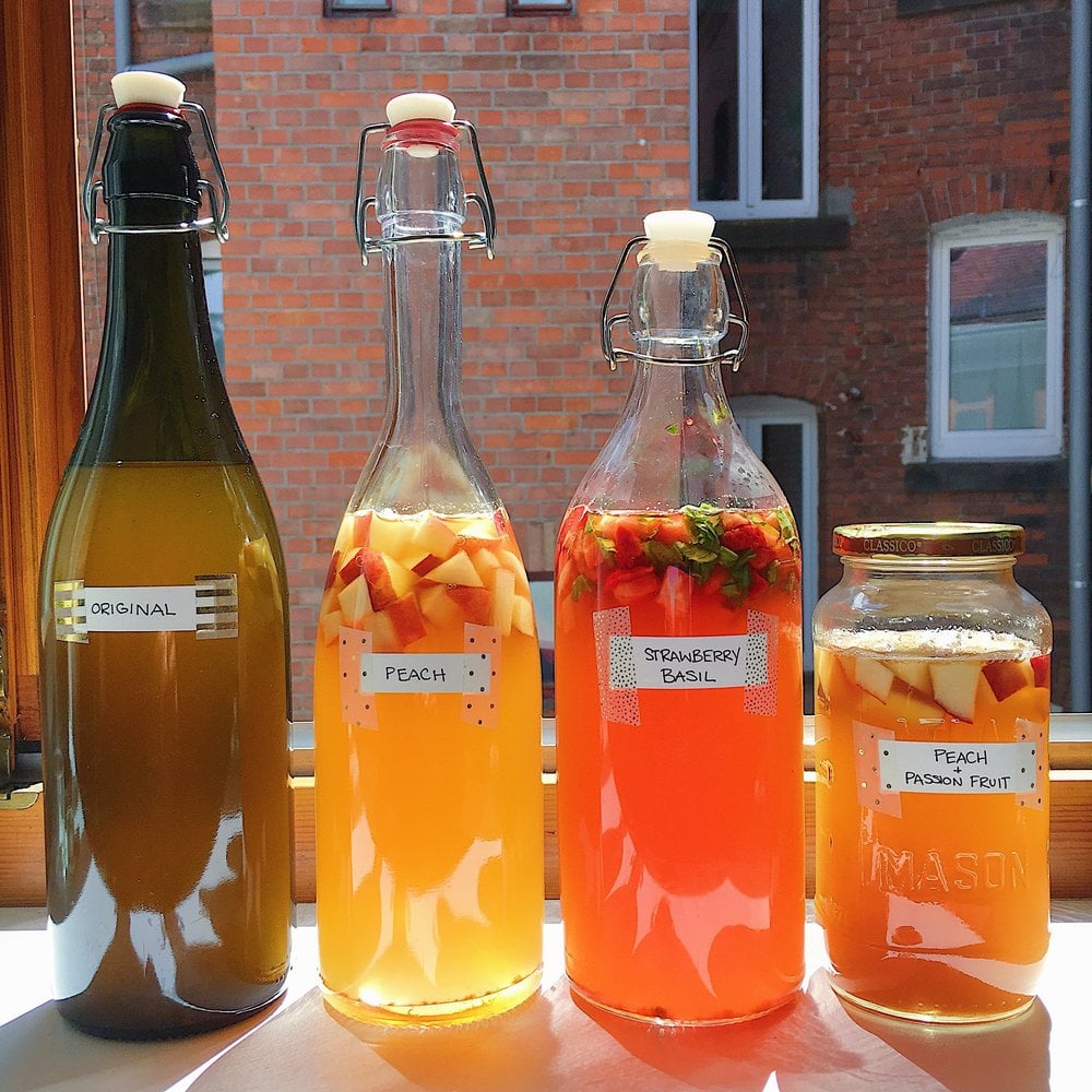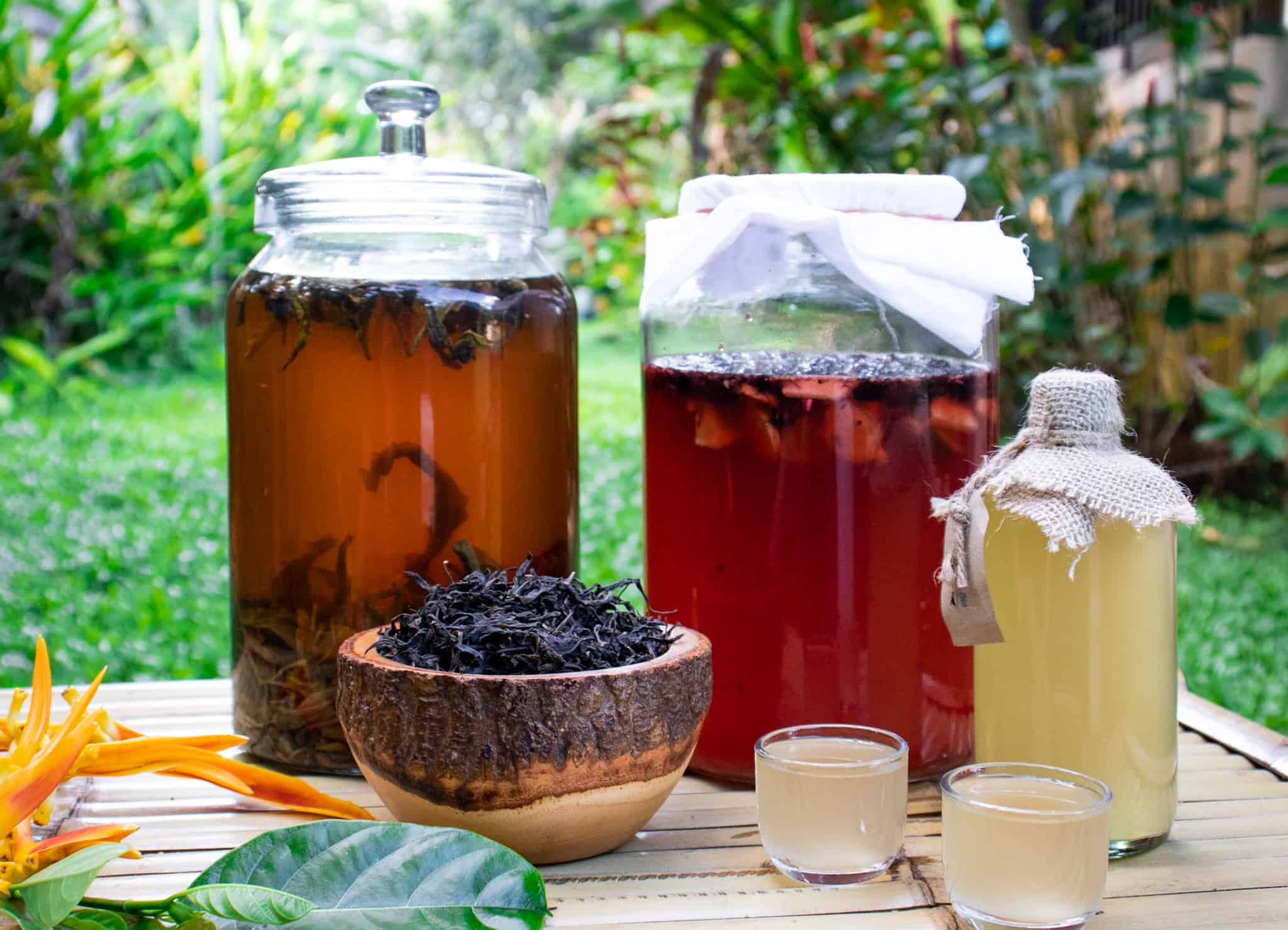 Podemos fazer Kombucha de limão, morango, abacaxi, mas também de rosas, jasmim ou hortelã. Podemos beber Kombucha como um drink com lima e zimbro, ou podemos fazer uma kombucha medicinal com sabugueiro, equinácea ou cúrcuma!