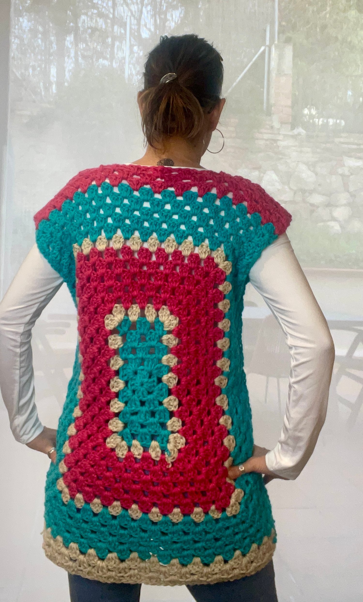 El Chaleco Japo está inspirado en líneas rectas y formas simples, como las prendas tradicionales japonesas. Se construye con piezas sencillas y sin complicaciones, ideal para tejer con calma y dejar que el hilo y la forma hablen por sí solos.