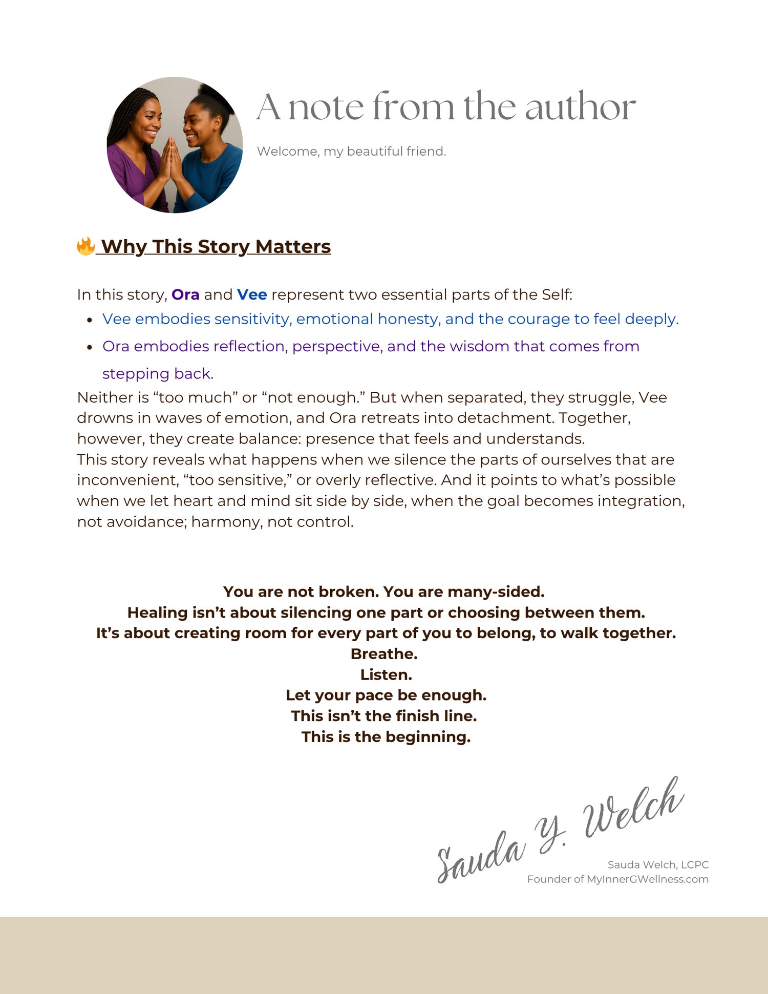 This workbook is built around the parable When Storm Meets Stillness, a powerful story about two Inner Guides: Ora, the reflective observer, and Vee, the deep-feeling empath. In the story, Ora and Vee struggle with tension many of us know well: one wants to analyze, the other wants to feel. Alone, they suffer. Together, they begin to understand what balance truly means.