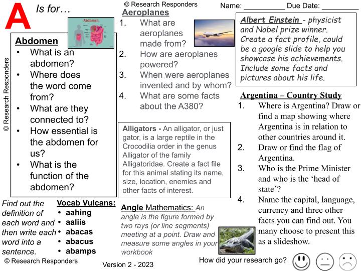 26 sheets of the alphabet, each sheet with 7 different activities - research, unusual objects, Maths and vocab and more.