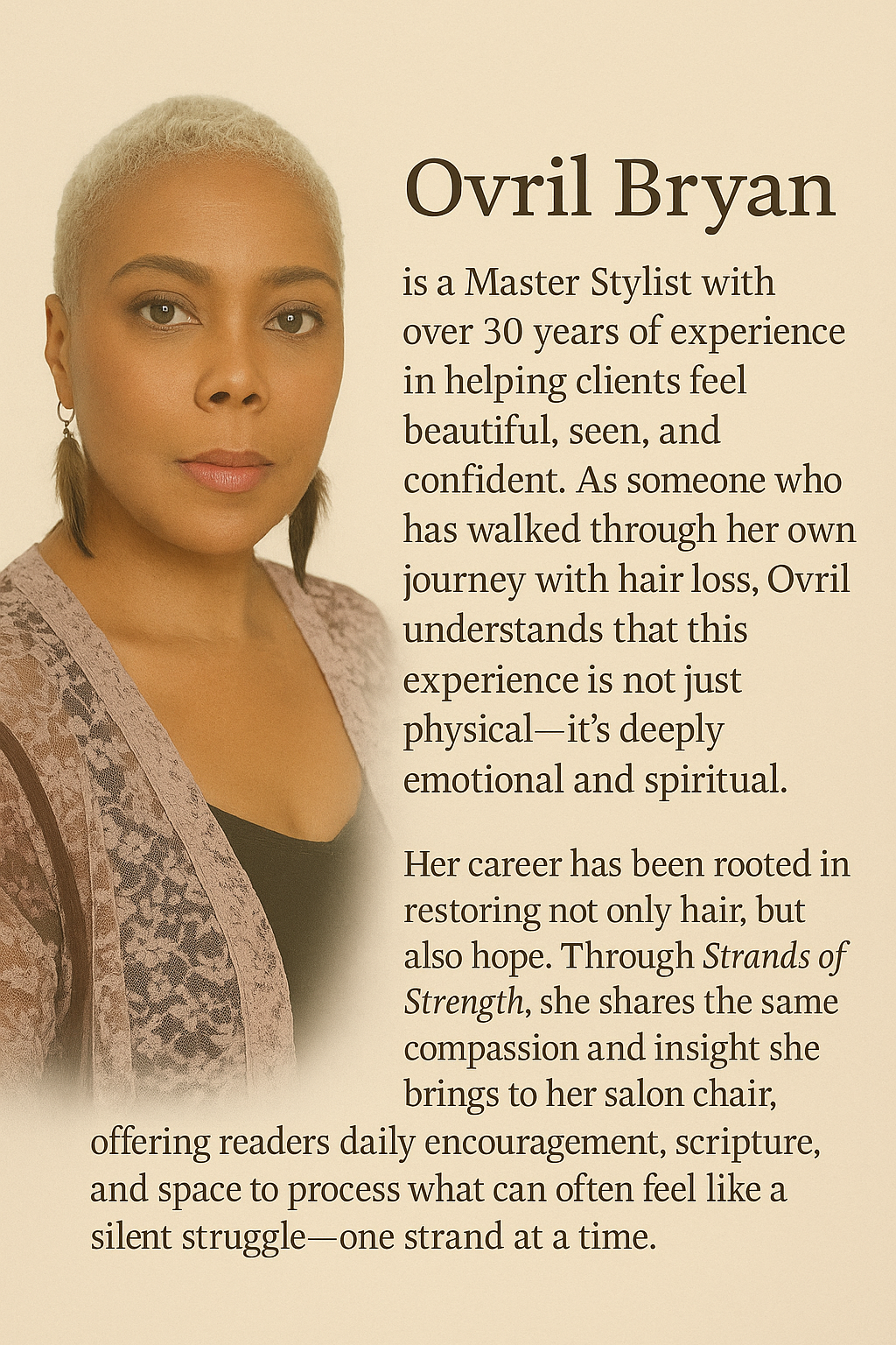 Written by master hairstylist and hair loss survivor Ovril Bryan, each day features a powerful scripture (NIV), a heartfelt reflection, and custom journaling prompts to help you rediscover your identity beyond your strands. With soothing silhouette-themed pages and a calming layout, Strands of Strength is more than a journal, it is a healing companion.
