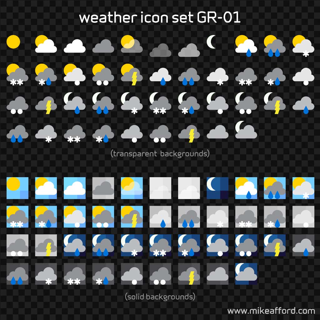 A set of weather icons designed strictly according to the principles of the Golden Ratio with 42 different weather conditions.