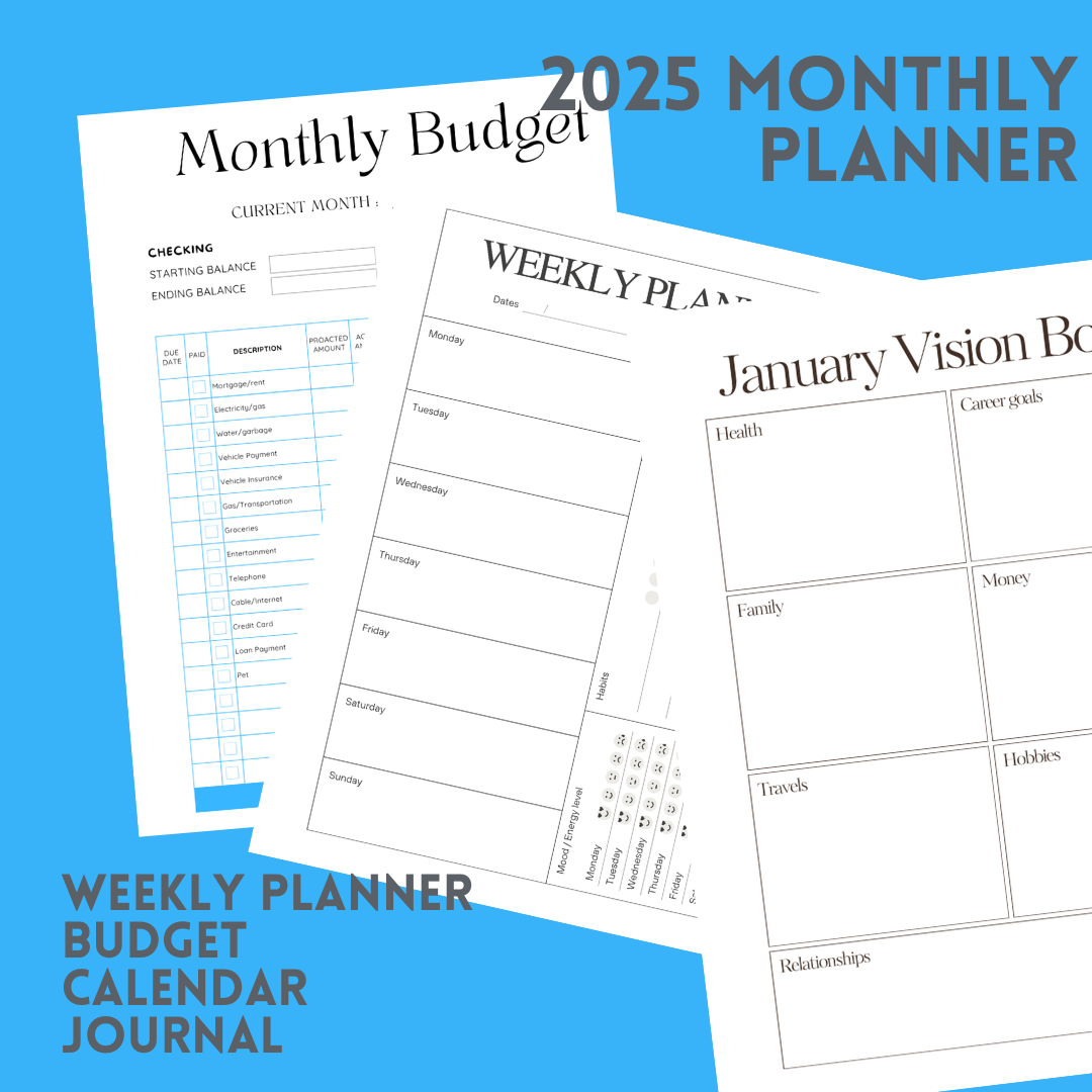 2025 Printable Monthly Planner (Vision Board, Calendar, Monthly Budget, Journal)