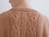 This cardigan is worked straight with no waist shaping. With its simple round neck and comfortable shape, it’s a perfect everyday wear. It features a cable pattern worked on each side of the front and repeated in the back with an elegant central braided cable.