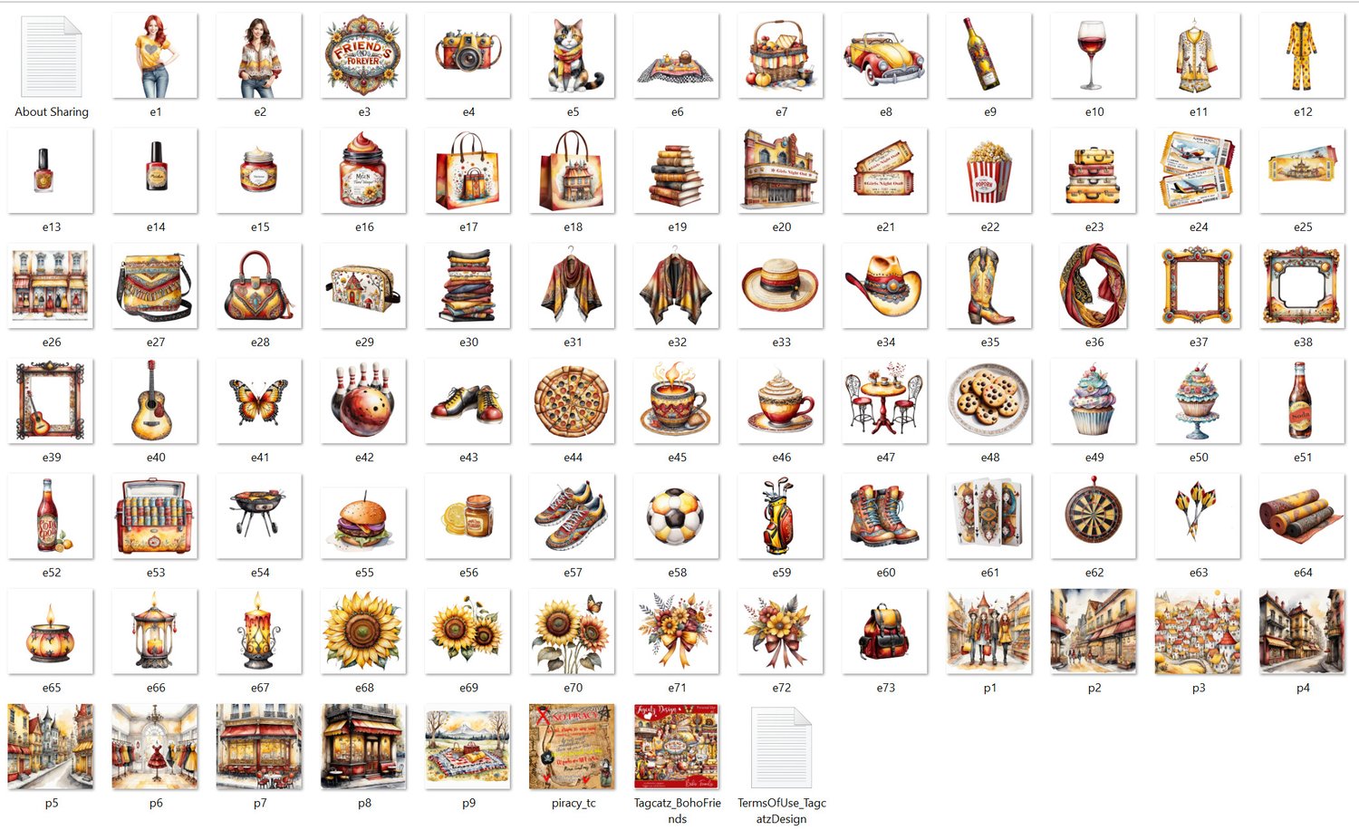 Friends forever, with all the things friends do - shopping, movie, bowling, picnic, golf and even sharing a glass of wine! 73 elements and 9 matching papers. AI generated. Tagger size. Not all shown. Personal use only.