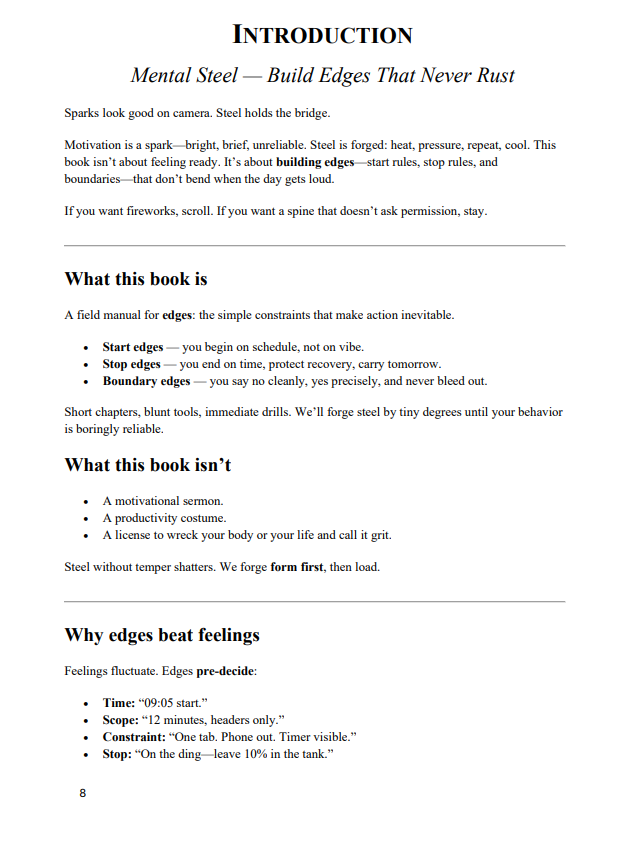 Mental Steel: Build Edges That Never Rust is a practical guide to building small rules that carry your day: start on time, stop on the timer, and protect clear boundaries. You’ll learn how to forge reliable routines with short loops, prevent “rust” (drift, scope creep, ego overruns, rescue-tax), and keep your progress steady during travel, deadlines, stress, and success.