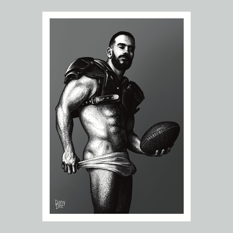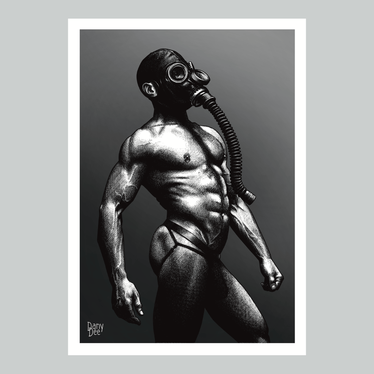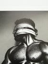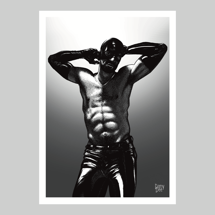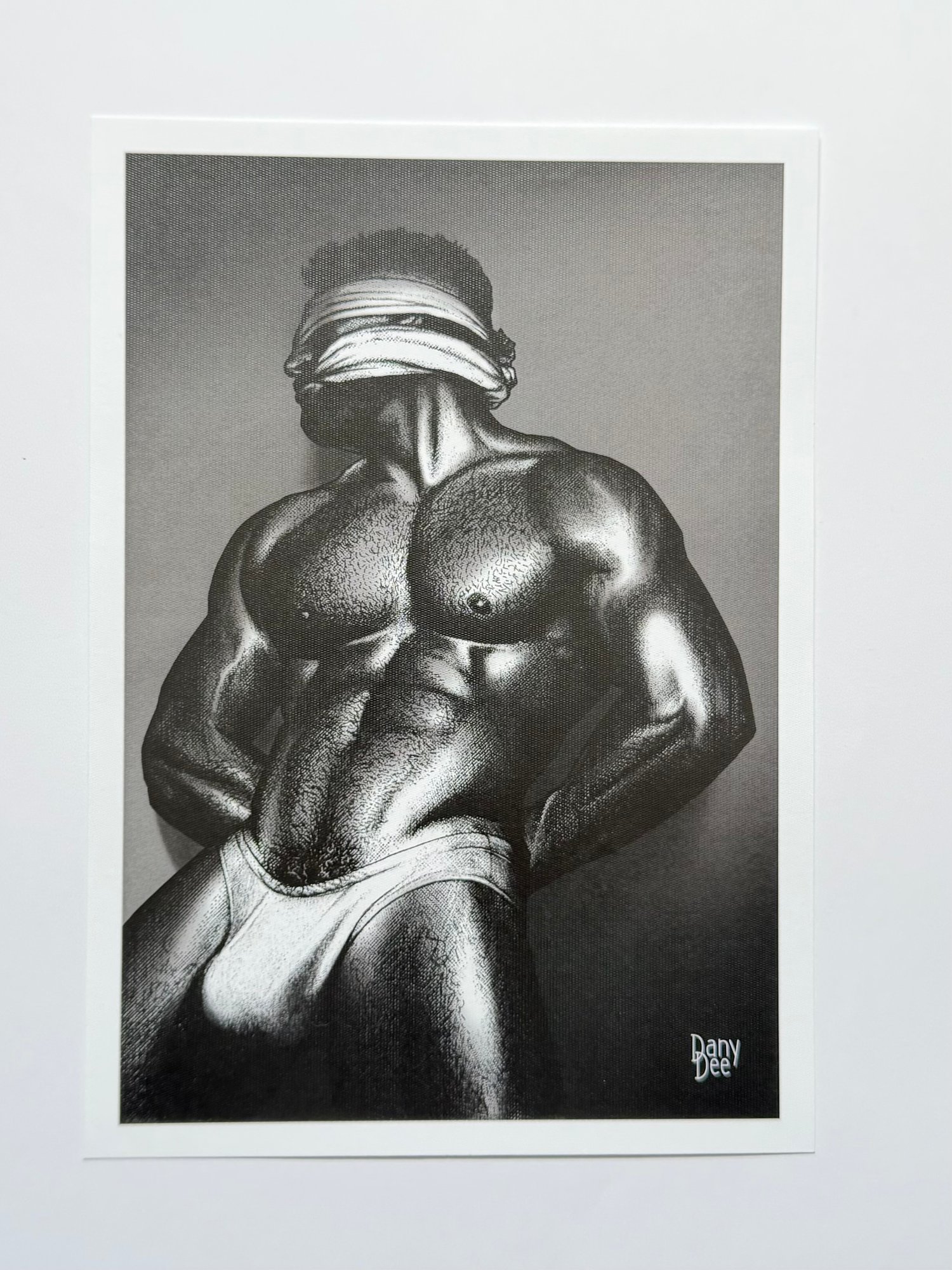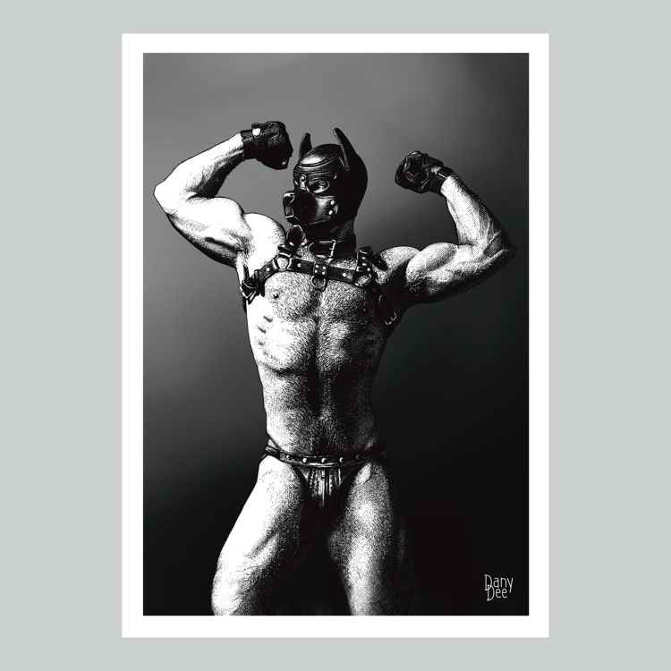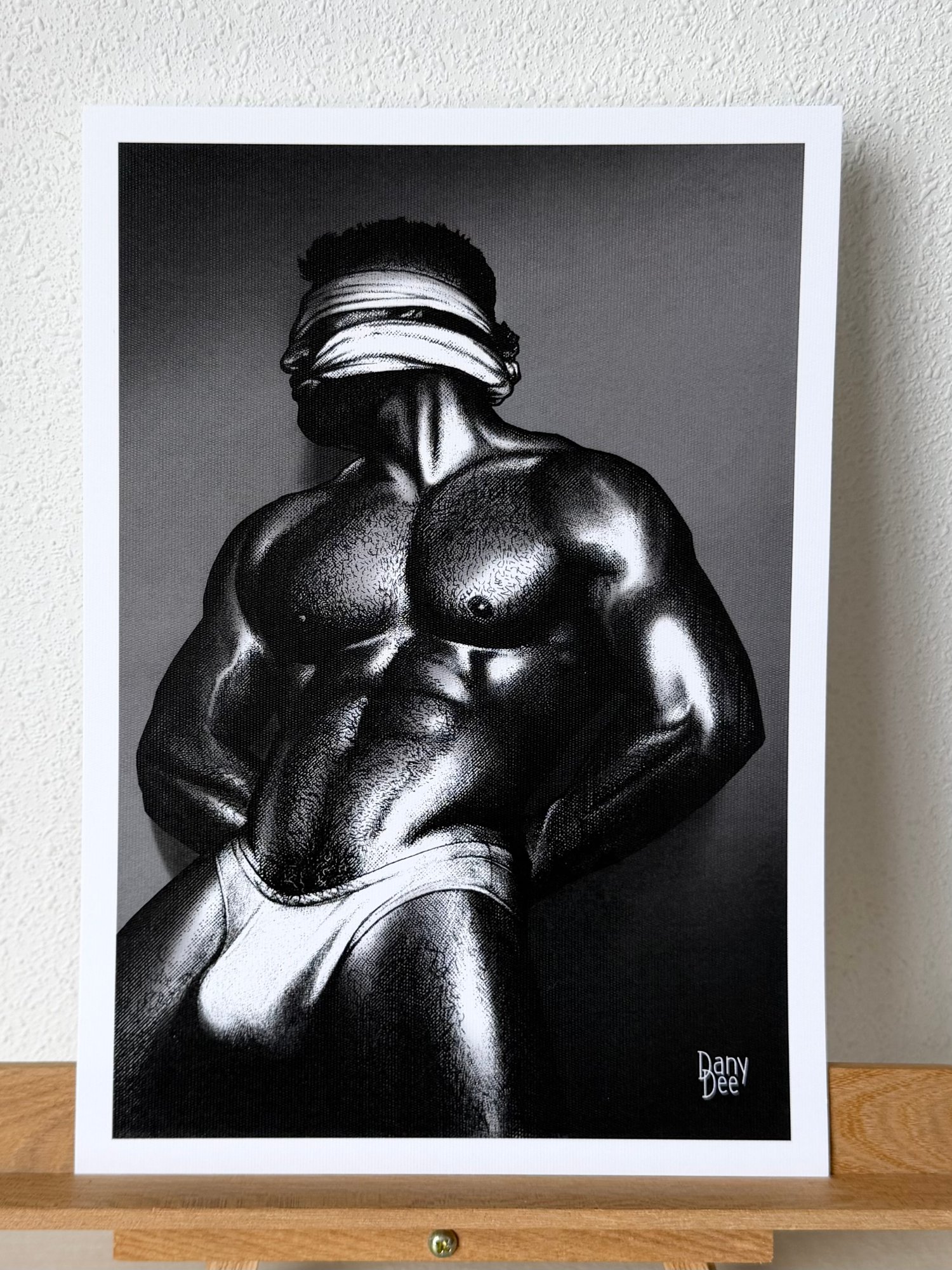 "The Silent" is a hand-drawn, monochromatic A4 art print celebrating BDSM submission culture — a powerful homoerotic illustration of a massively built man blindfolded and gagged, hands behind his back, perfect for gay BDSM art collectors or queer home decor.