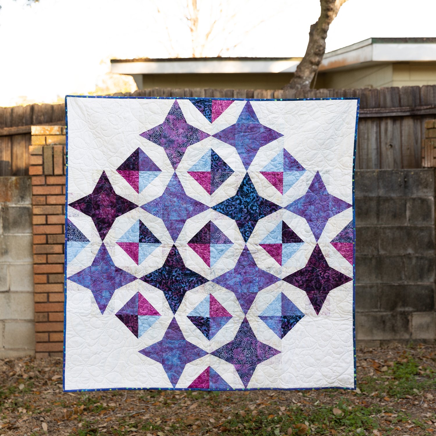 Astral Night is a shimmering star quilt pattern that lets your favorite prints take center stage while the background fades to a cozy shimmer. Build a whole constellation of spinning stars from precuts or scraps!
