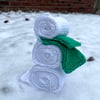 This snowman is on a roll! Commemorate a crappy year with a toilet paper version, or roll up a standard snowman just like the real thing. This pattern includes instructions for both! Measurements are given for both DK and worsted weight yarn, but you can make adjustments based on your own yarn. Three squishy strips are double-knit and then rolled into snowballs. Assembly is a breeze--simply stack the two-ply mega rolls and make a few stitches to hold them all together. Hang him from a Christmas tree branch and then move him to a doorknob or mantel to bring cheer all winter long.