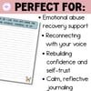 A gentle, supportive journaling guide designed to help you reconnect with yourself after emotional abuse. This printable journal includes 25 thoughtfully written prompts that guide reflection, healing, and self-trust—at your own pace, with no pressure to rush the process.
