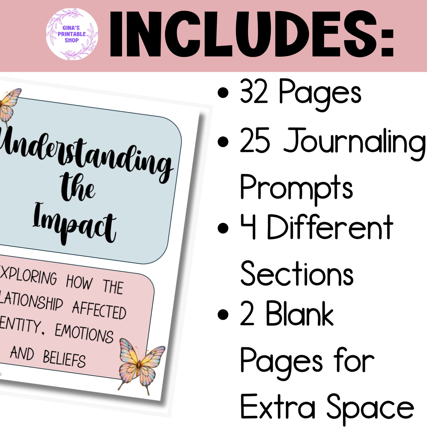 - 25 reflective journaling prompts, each on its own lined writing page