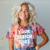 Peach, Blue Bullseye Tie Dye T-shirt Platinum Blonde Woman with Mockup Digital Download with Gray Background, Design Mocks, Tie Dye T-shirts