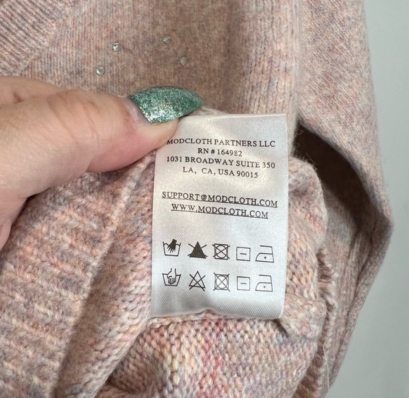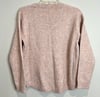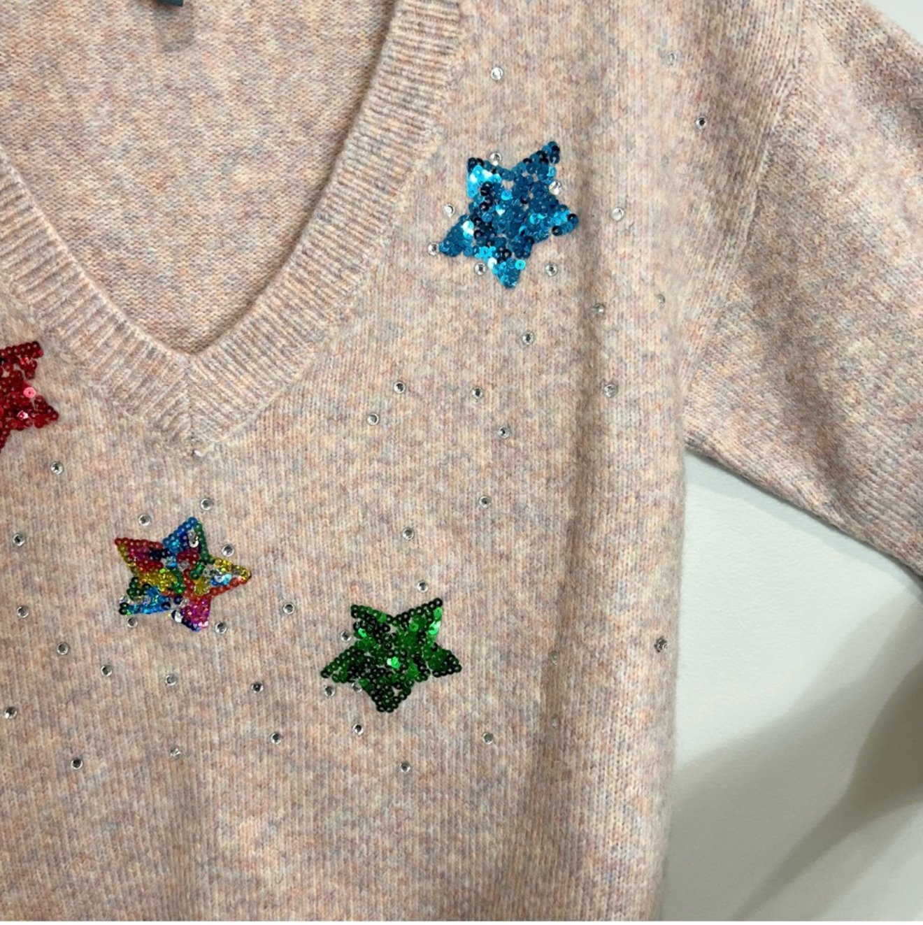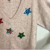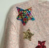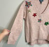 ModCloth pink with multicolor knit wool blend V-neck sweater with colorful sequin stars and rhinestones.